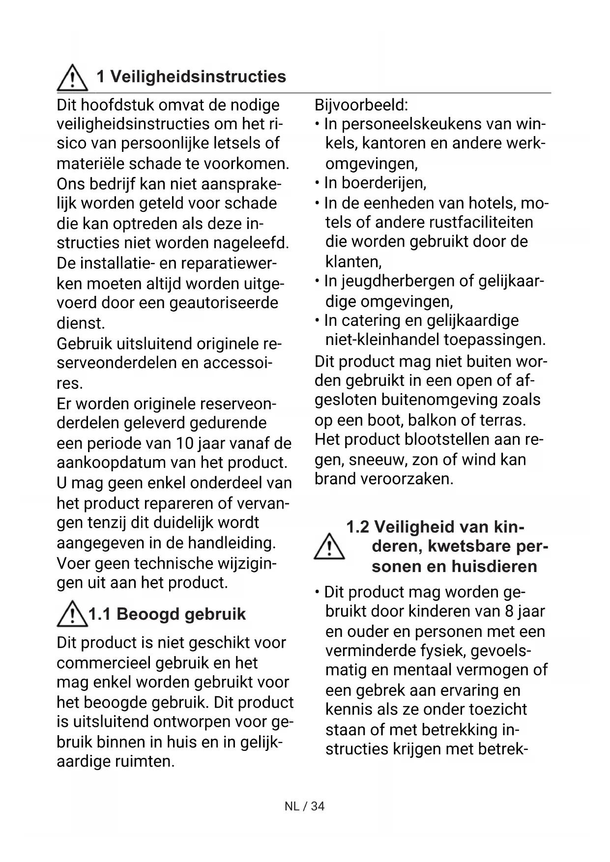 - Dit product mag worden ge- bruikt door kinderen van 8 jaar en ouder en personen met een verminderde fysiek, gevoels- matig en mentaal vermogen of een gebrek aan ervaring en kennis als ze onder toezicht staan of met betrekking in- structies krijgen met betrek-NL / 35 king tot het veilige gebruik van het apparaat en de betrokken risico’s.