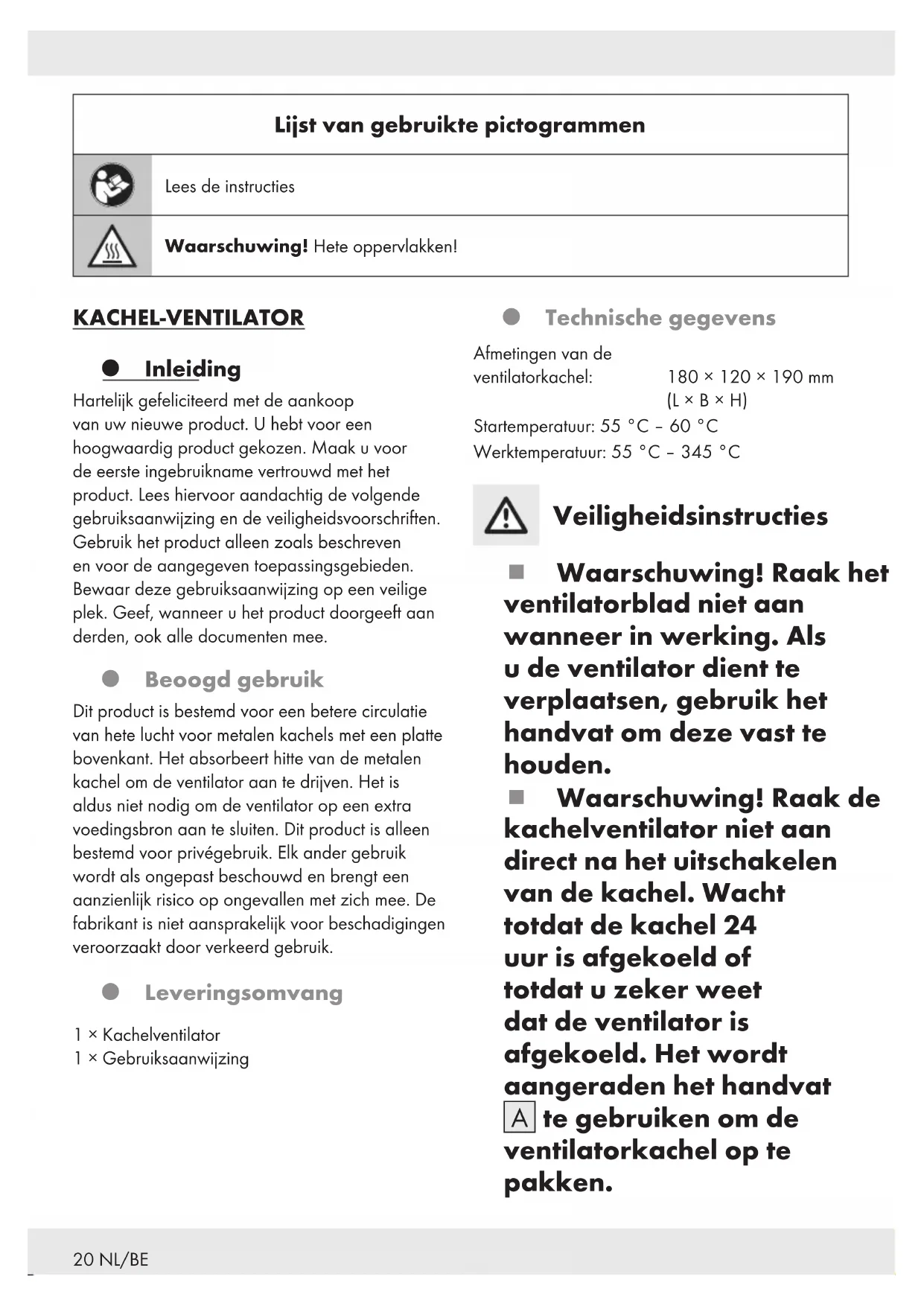 Waarschuwing voor brandwonden Het product wordt heet, niet aanraken, gevaar op brandwonden! Laat het product volledig afkoelen voordat het wordt verplaatst!