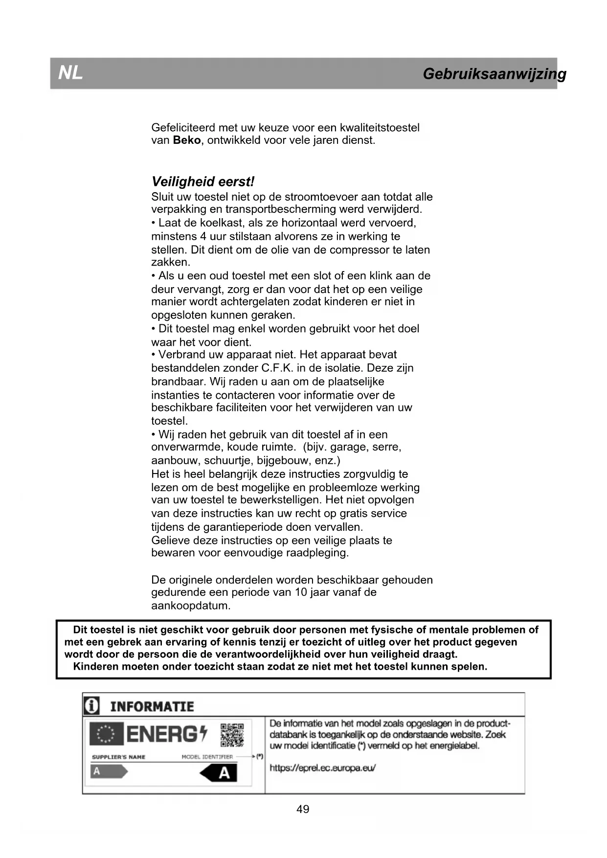 Dit toestel is niet geschikt voor gebruik door personen met fysische of mentale problemen of met een gebrek aan ervaring of kennis tenzij er toezicht of uitleg over het product gegeven wordt door de persoon die de verantwoordelijkheid over hun veiligheid draagt. Kinderen moeten onder toezicht staan zodat ze niet met het toestel kunnen spelen.NL Gebruiksaanwijzing Elektriciteitsvereisten Vergewis u ervan, alvorens u de stekker in het stopcontact steekt, dat de voltage en de frequentie op de kwalificatieplaat binnenin het toestel overeenkomen met uw stroomtoevoer. Na plaatsing van het apparaat moet de stekker eenvoudig toegankelijk blijven, zodat het mogelijk is om het apparaat na installatie van de stroomtoevoer af te sluiten. Waarschuwing! Dit toestel moet worden geaard. Reparaties aan de elektrische apparatuur mogen alleen door gekwalificeerde deskundigen worden uitgevoerd. Als de stroomkabel beschadigd is, moet deze – om gevaar te voorkomen – door de fabrikant of klantenservice worden vervangen. OPGELET! Dit toestel werkt op R600a. Dit is een milieuvriendelijk, maar brandbaar gas. Tijdens het transport en de plaatsing van het product moet er zorg voor worden gedragen dat het koelsysteem niet wordt beschadigd. Als het koelsysteem toch wordt beschadigd en er ontstaat een gaslek, houd het product dan verwijderd van open vuurbronnen en verlucht de kamer een tijdje. WAARSCHUWING - Gebruik geen andere mechanische toestellen of andere middelen om het ontdooiingproces te versnellen dan die toestellen of middelen die door de fabrikant worden aangeraden. WAARSCHUWING - Beschadig het koelcircuit niet. WAARSCHUWING - Gebruik geen elektrische toestellen in de bewaarladen van het toestel, tenzij ze door de fabrikant worden aangeraden. WAARSCHUWING - Indien het netsnoer beschadigd is, moet dit door de producent, de dealer of een ander gekwalificeerd persoon worden gerepareerd om gevaar te voorkomen. Transportinstructies