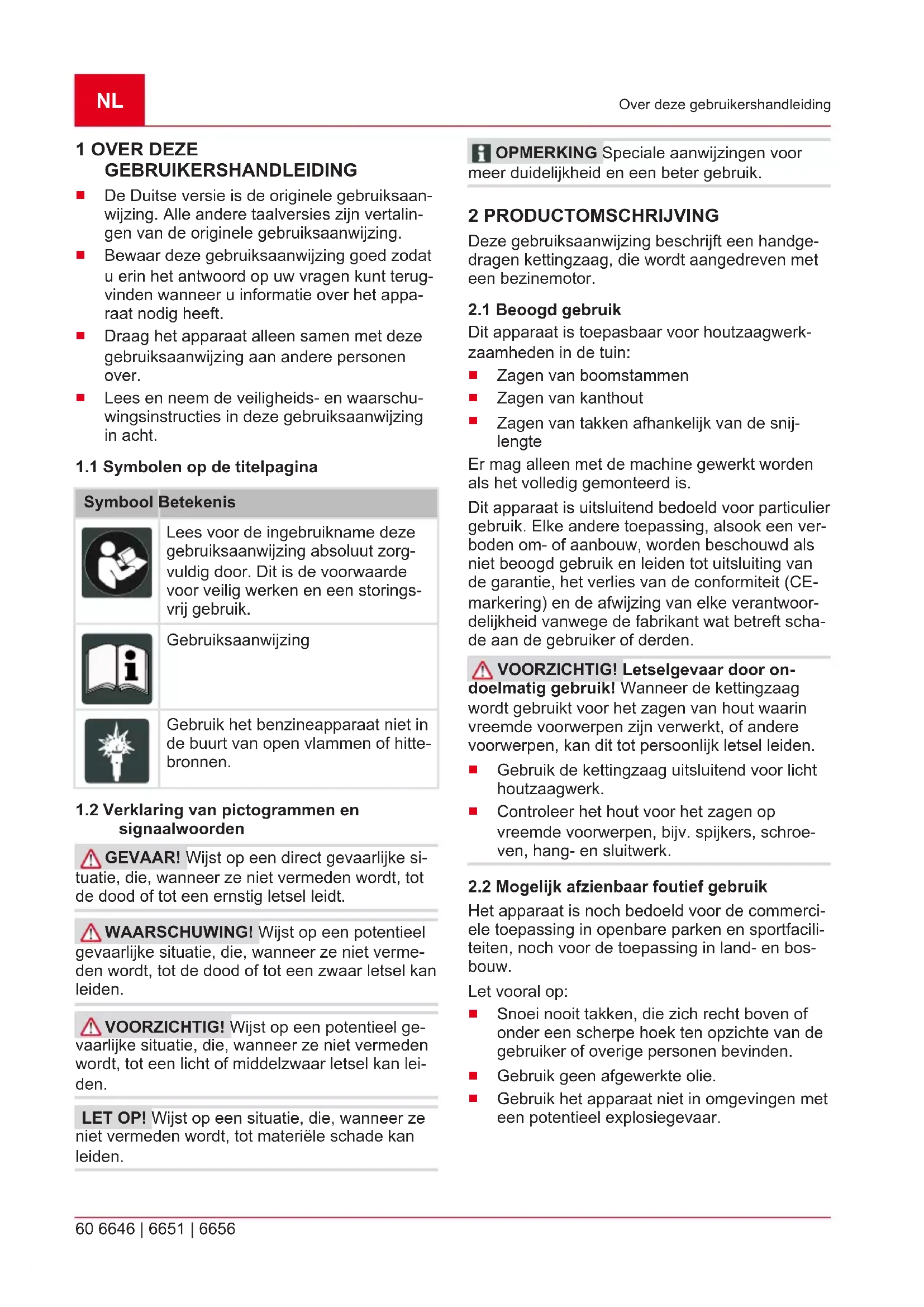 signaalwoorden GEVAAR! Wijst op een direct gevaarlijke si- tuatie, die, wanneer ze niet vermeden wordt, tot de dood of tot een ernstig letsel leidt. WAARSCHUWING! Wijst op een potentieel gevaarlijke situatie, die, wanneer ze niet verme- den wordt, tot de dood of tot een zwaar letsel kan leiden. VOORZICHTIG! Wijst op een potentieel ge- vaarlijke situatie, die, wanneer ze niet vermeden wordt, tot een licht of middelzwaar letsel kan lei- den. LET OP! Wijst op een situatie, die, wanneer ze niet vermeden wordt, tot materiële schade kan leiden. OPMERKING Speciale aanwijzingen voor meer duidelijkheid en een beter gebruik. 2 PRODUCTOMSCHRIJVING Deze gebruiksaanwijzing beschrijft een handge- dragen kettingzaag, die wordt aangedreven met een bezinemotor.