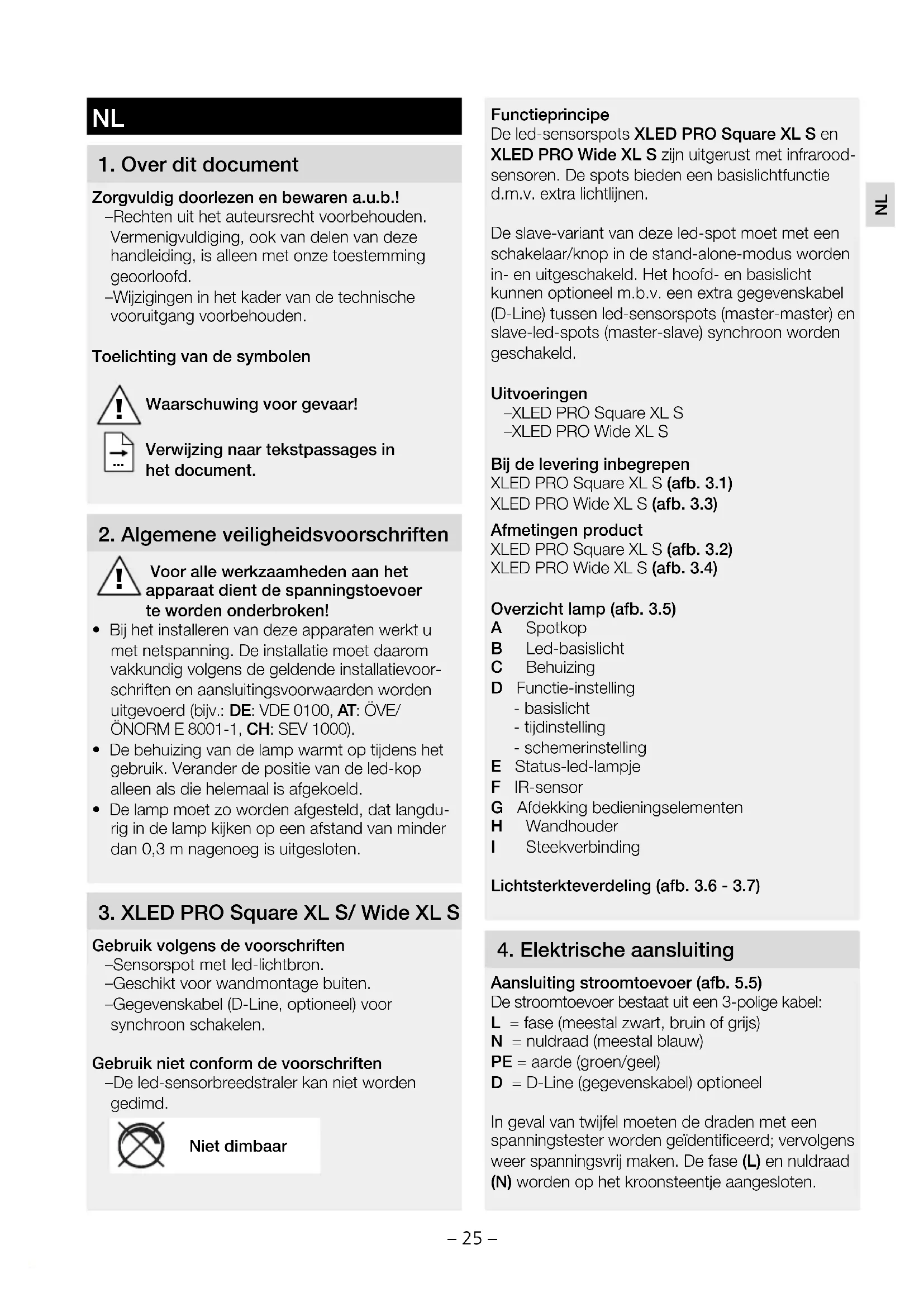 Gebruik volgens de voorschriften – Sensorspot met led-lichtbron. – Geschikt voor wandmontage buiten. – Gegevenskabel (D-Line, optioneel) voor synchroon schakelen. Gebruik niet conform de voorschriften – De led-sensorbreedstraler kan niet worden gedimd. Niet dimbaar Functieprincipe De led-sensorspots XLEDPROSquareXLS en XLEDPROWideXLS zijn uitgerust met infrarood- sensoren. De spots bieden een basislichtfunctie d.m.v. extra lichtlijnen. De slave-variant van deze led-spot moet met een schakelaar/knop in de stand-alone-modus worden in- en uitgeschakeld. Het hoofd- en basislicht kunnen optioneel m.b.v. een extra gegevenskabel (D-Line) tussen led-sensorspots (master-master) en slave-led-spots (master-slave) synchroon worden geschakeld. Uitvoeringen – XLEDPROSquareXLS – XLEDPROWideXLS Bij de levering inbegrepen XLEDPROSquareXLS (afb. 3.1) XLEDPROWideXLS (afb. 3.3) Afmetingen product XLEDPROSquareXLS (afb. 3.2) XLEDPROWideXLS (afb. 3.4) Overzicht lamp (afb. 3.5) A Spotkop B Led-basislicht C Behuizing D Functie-instelling - basislicht - tijdinstelling - schemerinstelling E Status-led-lampje F IR-sensor G Afdekking bedieningselementen H Wandhouder I Steekverbinding Lichtsterkteverdeling (afb. 3.6 - 3.7)