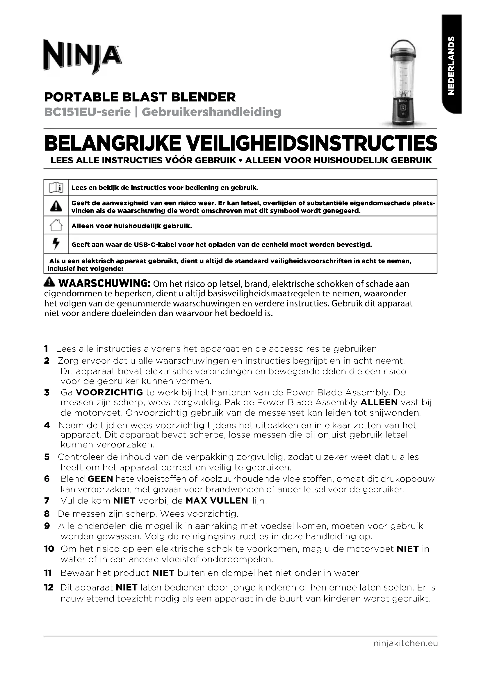 BC151EU-serie | Gebruikershandleiding 1 Lees alle instructies alvorens het apparaat en de accessoires te gebruiken.2 Zorg ervoor dat u alle waarschuwingen en instructies begrijpt en in acht neemt. Ditapparaat bevat elektrische verbindingen en bewegende delen die een risico voorde gebruiker kunnen vormen. 3 Ga VOORZICHTIG te werk bij het hanteren van de Power Blade Assembly. De messen zijn scherp, wees zorgvuldig. Pak de Power Blade Assembly ALLEEN vast bij de motorvoet. Onvoorzichtig gebruik van de messenset kan leiden tot snijwonden.4 Neem de tijd en wees voorzichtig tijdens het uitpakken en in elkaar zetten van het apparaat. Dit apparaat bevat scherpe, losse messen die bij onjuist gebruik letsel kunnen veroorzaken.5 Controleer de inhoud van de verpakking zorgvuldig, zodat u zeker weet dat u alles heeft om het apparaat correct en veilig te gebruiken. 6 Blend GEEN hete vloeistoen of koolzuurhoudende vloeistoen, omdat dit drukopbouw kan veroorzaken, met gevaar voor brandwonden of ander letsel voor de gebruiker. 7 Vul de kom NIET voorbij de MAX VULLEN-lijn. 8 De messen zijn scherp. Wees voorzichtig.9 Alle onderdelen die mogelijk in aanraking met voedsel komen, moeten voor gebruik worden gewassen. Volg de reinigingsinstructies in deze handleiding op. 10 Om het risico op een elektrische schok te voorkomen, mag u de motorvoet NIET in water of in een andere vloeistof onderdompelen. 11 Bewaar het product NIET buiten en dompel het niet onder in water. 12 Dit apparaat NIET laten bedienen door jonge kinderen of hen ermee laten spelen. Er is nauwlettend toezicht nodig als een apparaat in de buurt van kinderen wordt gebruikt. WAARSCHUWING: Om het risico op letsel, brand, elektrische schokken of schade aan eigendommen te beperken, dient u altijd basisveiligheidsmaatregelen te nemen, waaronder het volgen van de genummerde waarschuwingen en verdere instructies. Gebruik dit apparaat niet voor andere doeleinden dan waarvoor het bedoeld is. BELANGRIJKE VEILIGHEIDSINSTRUCTIES LEES ALLE INSTRUCTIES VÓÓR GEBRUIK • ALLEEN VOOR HUISHOUDELIJK GEBRUIKLees en bekijk de instructies voor bediening en gebruik.Geeft de aanwezigheid van een risico weer. Er kan letsel, overlijden of substantiële eigendomsschade plaats-vinden als de waarschuwing die wordt omschreven met dit symbool wordt genegeerd.Alleen voor huishoudelijk gebruik.Geeft aan waar de USB-C-kabel voor het opladen van de eenheid moet worden bevestigd. Als u een elektrisch apparaat gebruikt, dient u altijd de standaard veiligheidsvoorschriften in acht te nemen, inclusief het volgende: NEDERLANDSninjakitchen.eu 13 Dit apparaat is NIET bedoeld voor gebruik door personen met een beperkt fysiek, zintuiglijk of verstandelijk vermogen of gebrek aan ervaring en kennis, tenzij deze personen onder toezicht staan of instructies hebben gekregen over het gebruik van het apparaat van een persoon die verantwoordelijk is voor hun veiligheid. 14 Controleer vóór ieder gebruik de messensets op beschadiging. Neem als een mes krom of beschadigd is, contact op met SharkNinja voor vervanging.