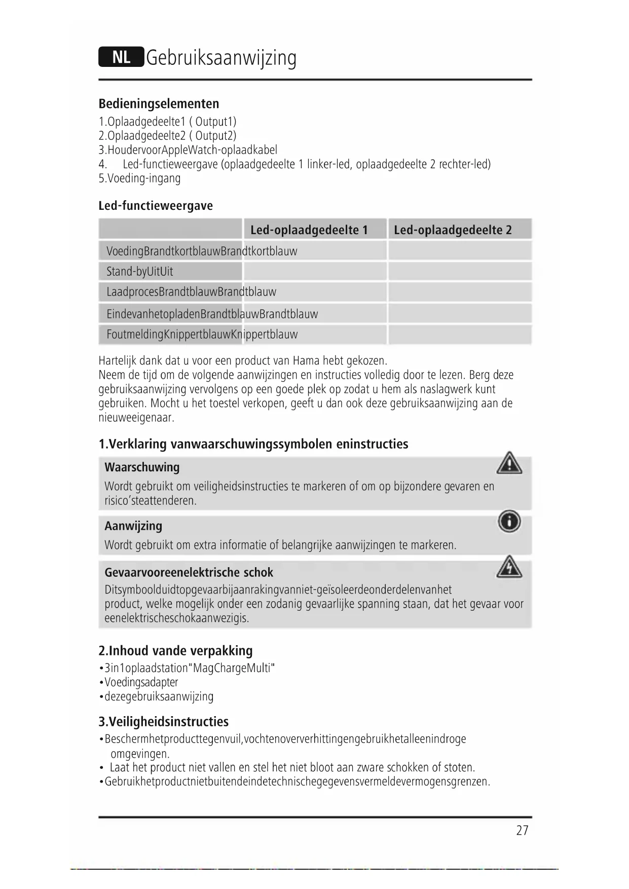 Led-functieweergave Led-oplaadgedeelte 1Led-oplaadgedeelte 2 Voeding Brandt kort blauw Brandt kort blauw Stand-by Uit Uit Laadproces Brandt blauw Brandt blauw Einde van het opladen Brandt blauw Brandt blauw Foutmelding Knippert blauw Knippert blauw Hartelkdank dat uvoor een product van Hama hebt gekozen. Neem de tdomdevolgende aanwzingen en instructies volledig door te lezen. Bergdeze gebruiksaanwzing vervolgens op een goede plek op zodat uhem als naslagwerk kunt gebruiken. Mocht uhet toestel verkopen, geeft udan ook deze gebruiksaanwzing aan de nieuwe eigenaar.
