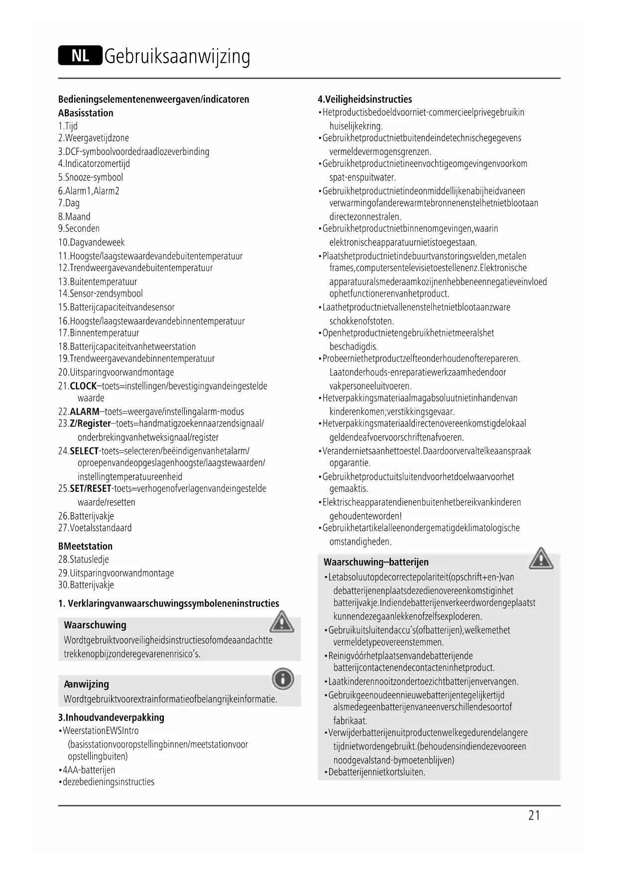 - Gebruik het artikel alleen onder gematigde klimatologische omstandigheden. Waarschuwing – batterijen