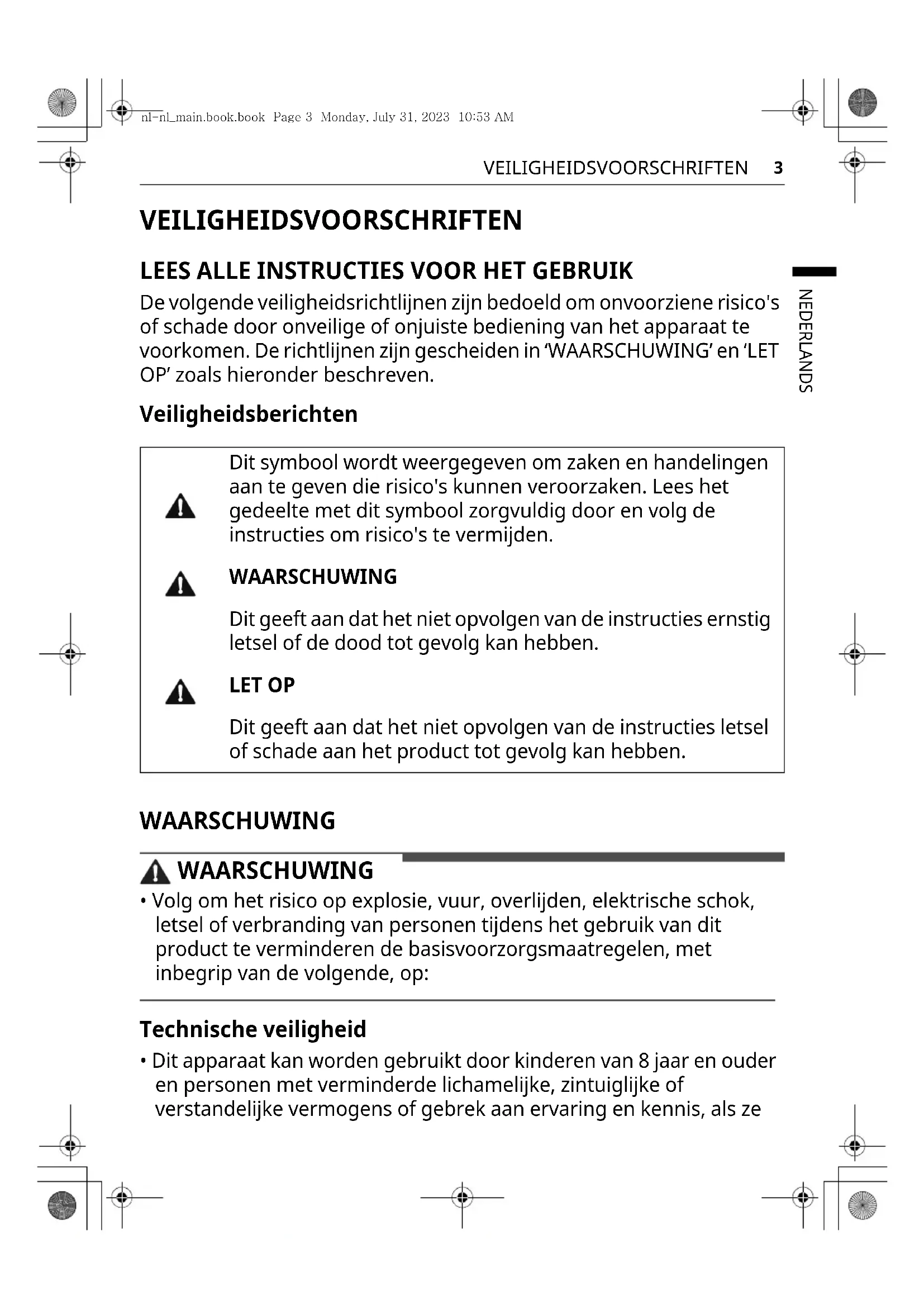 - Dit apparaat kan worden gebruikt door kinderen van 8 jaar en ouder en personen met verminderde lichamelijke, zintuiglijke of verstandelijke vermogens of gebrek aan ervaring en kennis, als ze Dit symbool wordt weergegeven om zaken en handelingen aan te geven die risico's kunnen veroorzaken. Lees het gedeelte met dit symbool zorgvuldig door en volg de instructies om risico's te vermijden. WAARSCHUWING Dit geeft aan dat het niet opvolgen van de instructies ernstig letsel of de dood tot gevolg kan hebben. LET OP Dit geeft aan dat het niet opvolgen van de instructies letsel of schade aan het product tot gevolg kan hebben. nl-nl_main.book.book Page 3 Monday, July 31, 2023 10:53 AM4 VEILIGHEIDSVOORSCHRIFTEN onder toezicht staan of worden geïnstrueerd over het veilig gebruik van het apparaat en bijbehorende gevaren begrijpen. Kinderen mogen niet met het apparaat spelen. Reiniging en onderhoud door de gebruiker mogen niet worden uitgevoerd door kinderen zonder toezicht.