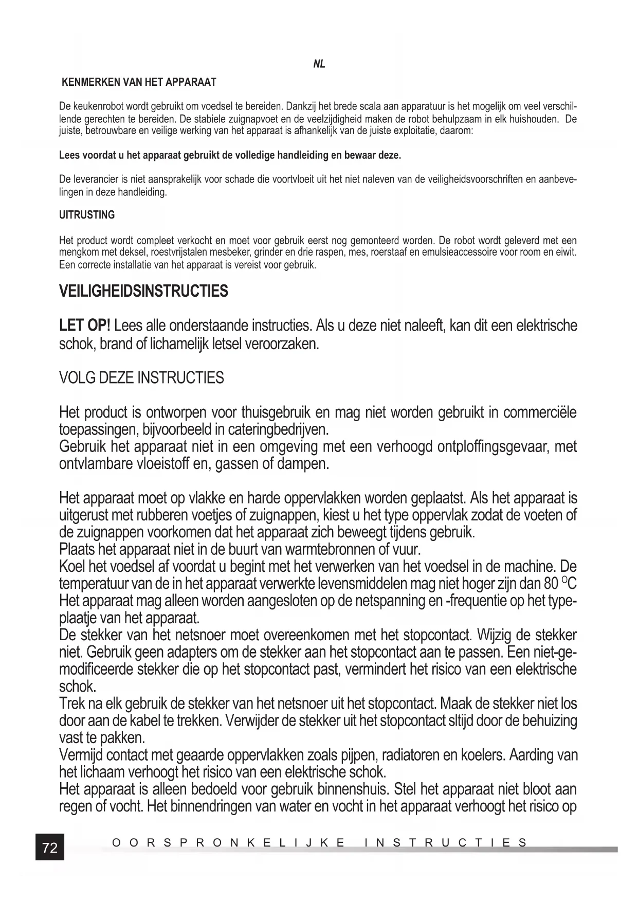 De keukenrobot wordt gebruikt om voedsel te bereiden. Dankzij het brede scala aan apparatuur is het mogelijk om veel verschil- lende gerechten te bereiden. De stabiele zuignapvoet en de veelzijdigheid maken de robot behulpzaam in elk huishouden. De juiste, betrouwbare en veilige werking van het apparaat is afhankelijk van de juiste exploitatie, daarom: Lees voordat u het apparaat gebruikt de volledige handleiding en bewaar deze. De leverancier is niet aansprakelijk voor schade die voortvloeit uit het niet naleven van de veiligheidsvoorschriften en aanbeve- lingen in deze handleiding. UITRUSTING Het product wordt compleet verkocht en moet voor gebruik eerst nog gemonteerd worden. De robot wordt geleverd met een mengkom met deksel, roestvrijstalen mesbeker, grinder en drie raspen, mes, roerstaaf en emulsieaccessoire voor room en eiwit. Een correcte installatie van het apparaat is vereist voor gebruik. VEILIGHEIDSINSTRUCTIES LET OP! Lees alle onderstaande instructies. Als u deze niet naleeft, kan dit een elektrische schok, brand of lichamelijk letsel veroorzaken.