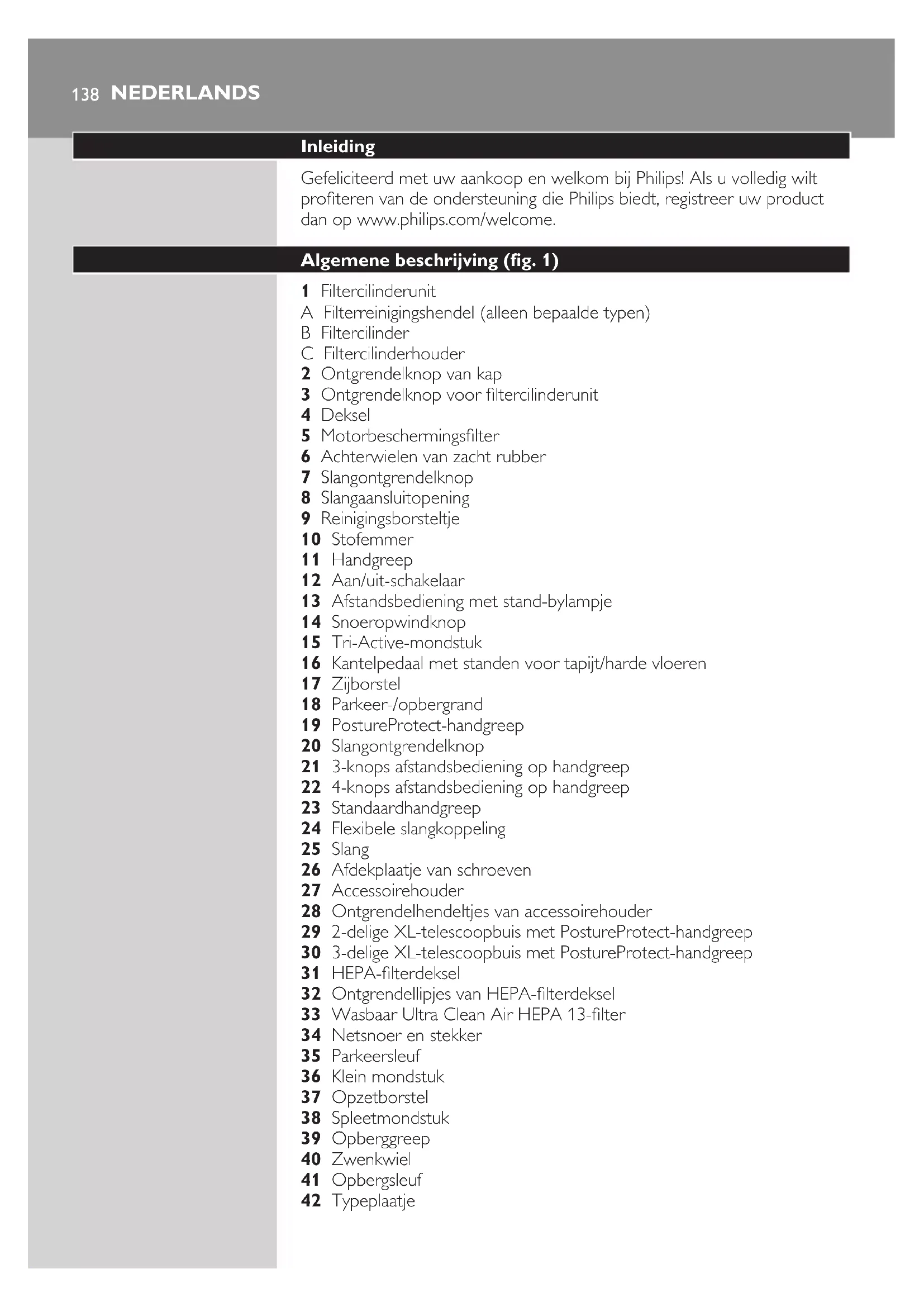 Filtercilinderunit A Filterreinigingshendel (alleen bepaalde typen) B Filtercilinder C Filtercilinderhouder Ontgrendelknop van kap Ontgrendelknop voor ltercilinderunit Deksel Motorbeschermingslter Achterwielen van zacht rubber Slangontgrendelknop Slangaansluitopening Reinigingsborsteltje Stofemmer Handgreep Aan/uit-schakelaar Afstandsbediening met stand-bylampje Snoeropwindknop Tri-Active-mondstuk Kantelpedaal met standen voor tapijt/harde vloeren Zijborstel Parkeer-/opbergrand PostureProtect-handgreep Slangontgrendelknop 3-knops afstandsbediening op handgreep 4-knops afstandsbediening op handgreep Standaardhandgreep Flexibele slangkoppeling Slang Afdekplaatje van schroeven Accessoirehouder Ontgrendelhendeltjes van accessoirehouder 2-delige XL-telescoopbuis met PostureProtect-handgreep 3-delige XL-telescoopbuis met PostureProtect-handgreep HEPA-lterdeksel Ontgrendellipjes van HEPA-lterdeksel Wasbaar Ultra Clean Air HEPA 13-lter Netsnoer en stekker Parkeersleuf Klein mondstuk Opzetborstel Spleetmondstuk Opberggreep Zwenkwiel Opbergsleuf Typeplaatje