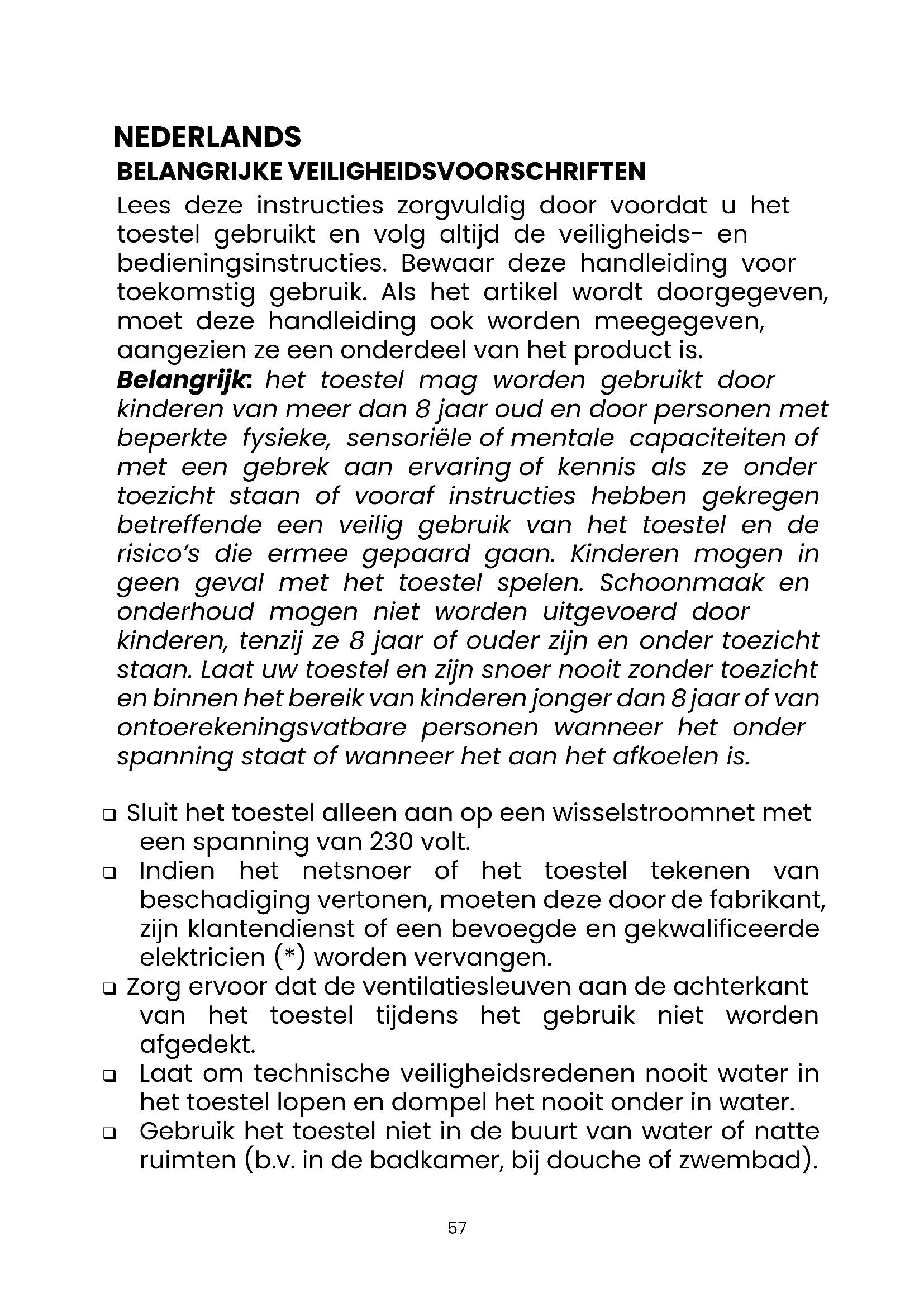 NEDERLANDS BELANGRIJKE VEILIGHEIDSVOORSCHRIFTEN Lees deze instructies zorgvuldig door voordat u het toestel gebruikt en volg altijd de veiligheids- en bedieningsinstructies. Bewaar deze handleiding voor toekomstig gebruik. Als het artikel wordt doorgegeven, moet deze handleiding ook worden meegegeven, aangezien ze een onderdeel van het product is. Belangrijk: het toestel mag worden gebruikt door kinderen van meer dan 8 jaar oud en door personen met beperkte fysieke, sensoriële of mentale capaciteiten of met een gebrek aan ervaring of kennis als ze onder toezicht staan of vooraf instructies hebben gekregen betreffende een veilig gebruik van het toestel en de risico’s die ermee gepaard gaan. Kinderen mogen in geen geval met het toestel spelen. Schoonmaak en onderhoud mogen niet worden uitgevoerd door kinderen, tenzij ze 8 jaar of ouder zijn en onder toezicht staan. Laat uw toestel en zijn snoer nooit zonder toezicht en binnen het bereik van kinderen jonger dan 8 jaar of van ontoerekeningsvatbare personen wanneer het onder spanning staat of wanneer het aan het afkoelen is. ❑ Sluit het toestel alleen aan op een wisselstroomnet met een spanning van 230 volt. ❑ Indien het netsnoer of het toestel tekenen van beschadiging vertonen, moeten deze door de fabrikant, zijn klantendienst of een bevoegde en gekwalificeerde elektricien (*) worden vervangen. ❑ Zorg ervoor dat de ventilatiesleuven aan de achterkant van het toestel tijdens het gebruik niet worden afgedekt. ❑ Laat om technische veiligheidsredenen nooit water in het toestel lopen en dompel het nooit onder in water. ❑ Gebruik het toestel niet in de buurt van water of natte ruimten (b.v. in de badkamer, bij douche of zwembad).58