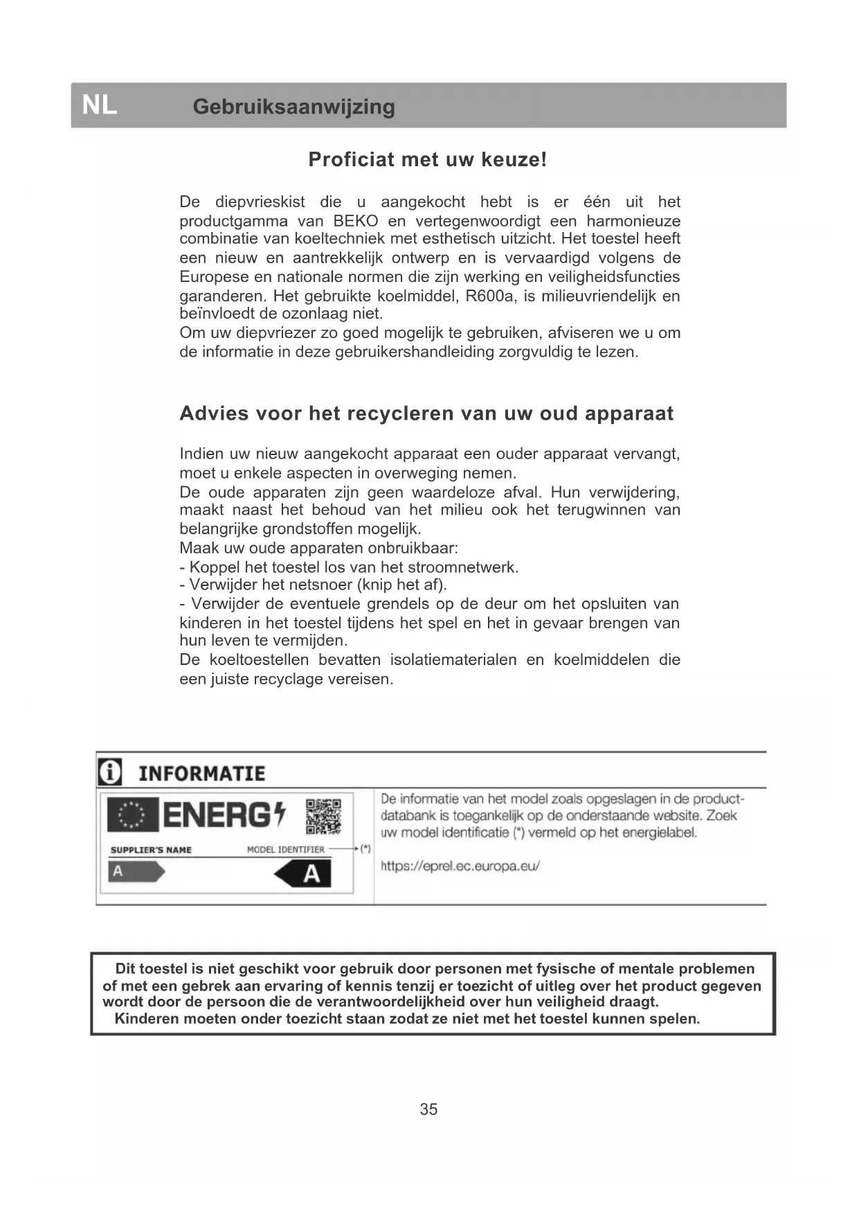 NL Gebruiksaanwijzing Dit toestel is niet geschikt voor gebruik door personen met fysische of mentale problemen of met een gebrek aan ervaring of kennis tenzij er toezicht of uitleg over het product gegeven wordt door de persoon die de verantwoordelijkheid over hun veiligheid draagt. Kinderen moeten onder toezicht staan zodat ze niet met het toestel kunnen spelen.Recycleren van de verpa kking WAARSCHUWING! Laat kinderen niet met de verpakking of delen ervan spelen. Er bestaat een risico op verstikking met delen van golfkarton en met plastic folie. Om het toestel in een goede toestand tot bij u te krijgen, werd het beschermd door een geschikte verpakking. Alle materialen van de verpakking zijn compatibel met het milieu en recycleerbaar. Help ons de verpakking te recycleren om het milieu te beschermen. BELANGRIJK! Voor u het apparaat in werking stelt, moet u deze instructies zorgvuldig en volledig lezen. Ze bevatten belangrijke informatie betreffende de installatie, het gebruik en het onderhoud van het apparaat. De fabrikant is niet verantwoordelijk indien de informatie in dit document niet in acht wordt genomen. Bewaar de instructies op een veilige plaats om ze indien nodig gemakkelijk te kunnen lezen. Ze kunnen vervolgens ook nuttig zijn voor een andere gebruiker. OPGELET! Dit apparaat moet enkel worden gebruikt voor het doel waarvoor het bestemd is (huishoudelijk gebruik), in g eschikte gebieden, ver weg van regen, vochtigheid of andere weersomstandigheden. Transportinstructies Dit apparaat moet zoveel mogelijk uitsluitend in de verticale positie worden getransporteerd. De verpakking moet tijdens het transport in perfecte cond itie zijn. Indien het apparaat in de horizontale positie werd vervoerd (enkel volgens de markeringen op de verpakking), wordt geadviseerd dat voor het apparaat in werking wordt gesteld, men het best gedurende 12 uur laat staan om het koelcircuit te laten rusten. Het niet inachtnemen van deze instructies kan een defect van de motorcompressor veroorzaken en de garantie annuleren. Waarschuwingen en algemeen advies z Steek de stekker van het apparaat niet in het stopcontact indien u een defect opmerkt. z Reparaties mogen enkel worden uitgevoerd door bevoegd personeel. z Verwijder de stekker uit het stopcontact in de volgende situaties: - wanneer u het apparaat volledig ontvriest; - wanneer u het apparaat reinigt. Om de stekker uit het stopcontact te verwijderen, trek aan de stekker en niet aan de kabel. z Zorg dat er een minimum ruimte is tussen het apparaat en de muur waartegen het apparaat wordt geplaatst. z Klim niet op het apparaat.z Laat kinderen niet met het apparaat spelen of erin klimmen. z Gebruik nooit elektrische toestellen binnenin de diepvriezer om te ontdooien. z Gebruik het apparaat niet nabij verwarmingstoestellen, fornuizen of andere bronnen van warmte en vuur. z Laat de diepvriezer niet langer open staan dan nodig om voedsel erin te plaatsen of eruit te halen. z Laat geen voedsel in het apparaat indien het niet werkt. z Plaats geen producten in het apparaat die ontvlambare of explosieve gassen bevatten. z Plaats geen bruisende dranken (sap, mineraal water, champagne, enz.) in de diepvriezer: de fles kan ontploffen! Vries geen dranken in plastic flessen in. z Eet geen ijsblokjes of roomijs onmiddellijk nadat u deze uit de diepvriezer hebt genomen omdat ze “vriesbrandwonden” kunnen veroorzaken. z Raak nooit koude metalen delen of bevroren voedsel aan met natte handen omdat uw handen snel kunnen bevriezen op zeer koude oppervlakken. z Ter bescherming van het toestel in de opslagplaats en tijdens het transport worden tussenstukken geleverd tussen de deur en kast (aan de voorkant - en achterkant). Deze tussenstukken worden verwijderd voor het toestel in gebruik wordt genomen.
