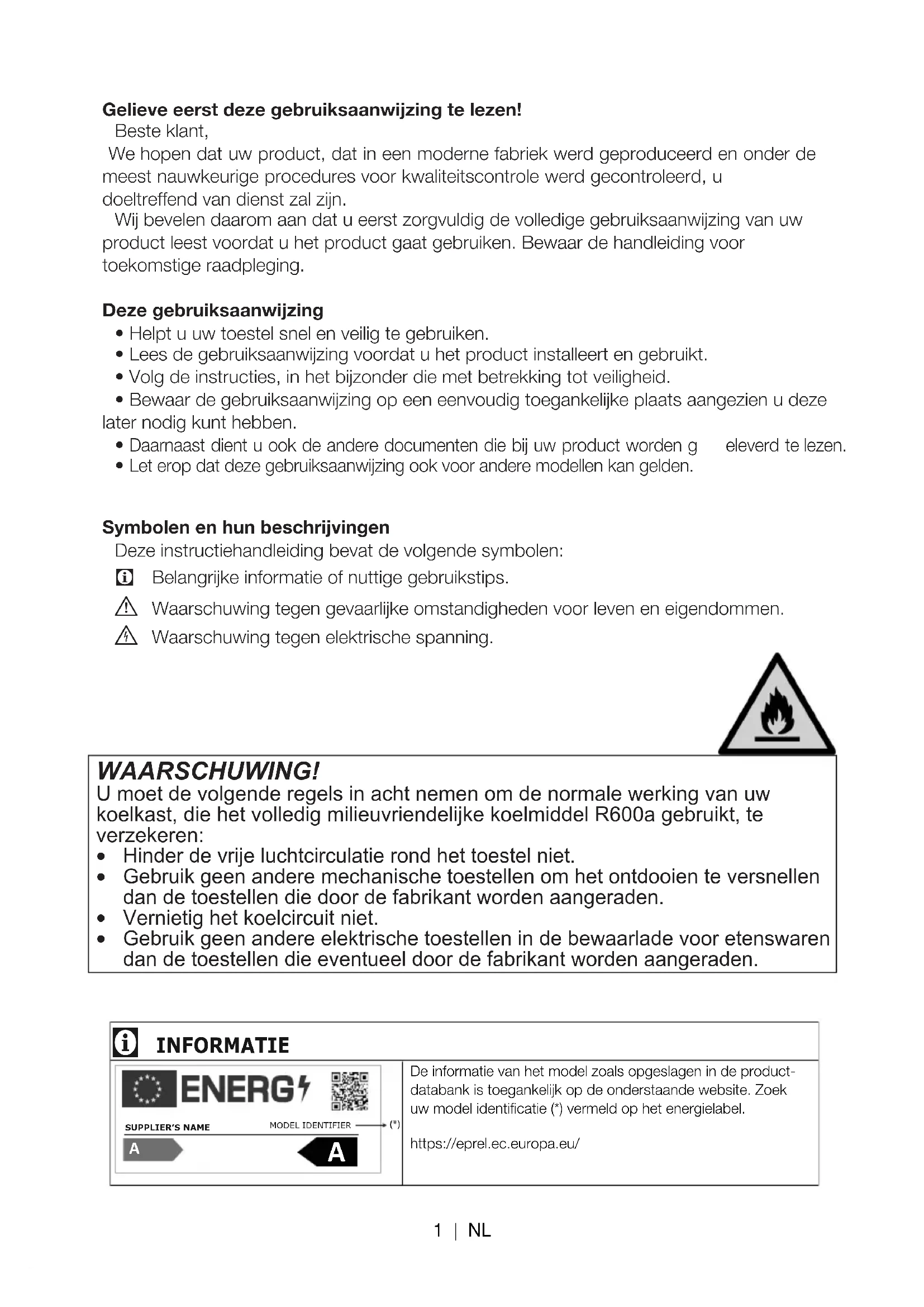 Let erop dat deze gebruiksaanwijzing ook voor andere modellen kan gelden.Symbolen en hun beschrijvingenDeze instructiehandleiding bevat de volgende symbolen: Belangrijke informatie of nuttige gebruikstips. Waarschuwing tegen gevaarlijke omstandigheden voor leven en eigendommen. Waarschuwing tegen elektrische spanning. WAARSCHUWING! U moet de volgende regels in acht nemen om de normale werking van uw koelkast, die het volledig milieuvriendelijke koelmiddel R600a gebruikt, te verzekeren: