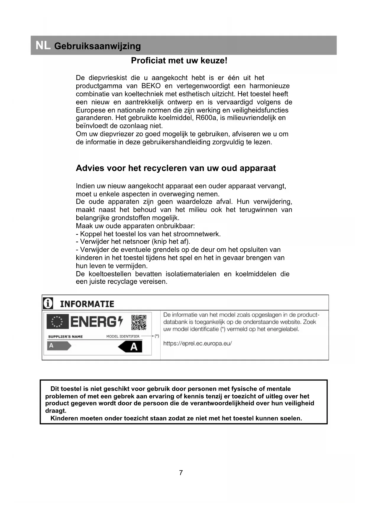EN Instruction for use The symbol on the product or on packaging indicates that this product may not be treated as household waste. Instead it shall be handed over to the applicable collection point for the recycling of electrical and electronic equipment. By ensuring this product is disposed of correctly, you will help prevent potential negative consequences for the environment and human health, which could otherwise be otherwise be caused by inappropriate waste handling of this product. For more detailed information about recycling of this product, please contact your local city office, you household waste disposal service or the shop where you purchased the product.Proficiat met uw keuze! De diepvrieskist die u aangekocht hebt is er één uit het productgamma van BEKO en vertegenwoordigt een harmonieuze combinatie van koeltechniek met esthetisch uitzicht. Het toestel heeft een nieuw en aantrekkelijk ontwerp en is vervaardigd volgens de Europese en nationale normen die zijn werking en veiligheidsfuncties garanderen. Het gebruikte koelmiddel, R600a, is milieuvriendelijk en beïnvloedt de ozonlaag niet. Om uw diepvriezer zo goed mogelijk te gebruiken, afviseren we u om de informatie in deze gebruikershandleiding zorgvuldig te lezen. Advies voor het recycleren van uw oud apparaat Indien uw nieuw aangekocht apparaat een ouder apparaat vervangt, moet u enkele aspecten in overweging nemen. De oude apparaten zijn geen waardeloze afval. Hun verwijdering, maakt naast het behoud van het milieu ook het terugwinnen van belangrijke grondstoffen mogelijk. Maak uw oude apparaten onbruikbaar: - Koppel het toestel los van het stroomnetwerk. - Verwijder het netsnoer (knip het af). - Verwijder de eventuele grendels op de deur om het opsluiten van kinderen in het toestel tijdens het spel en het in gevaar brengen van hun leven te vermijden. De koeltoestellen bevatten isolatiematerialen en koelmiddelen die een juiste recyclage vereisen.