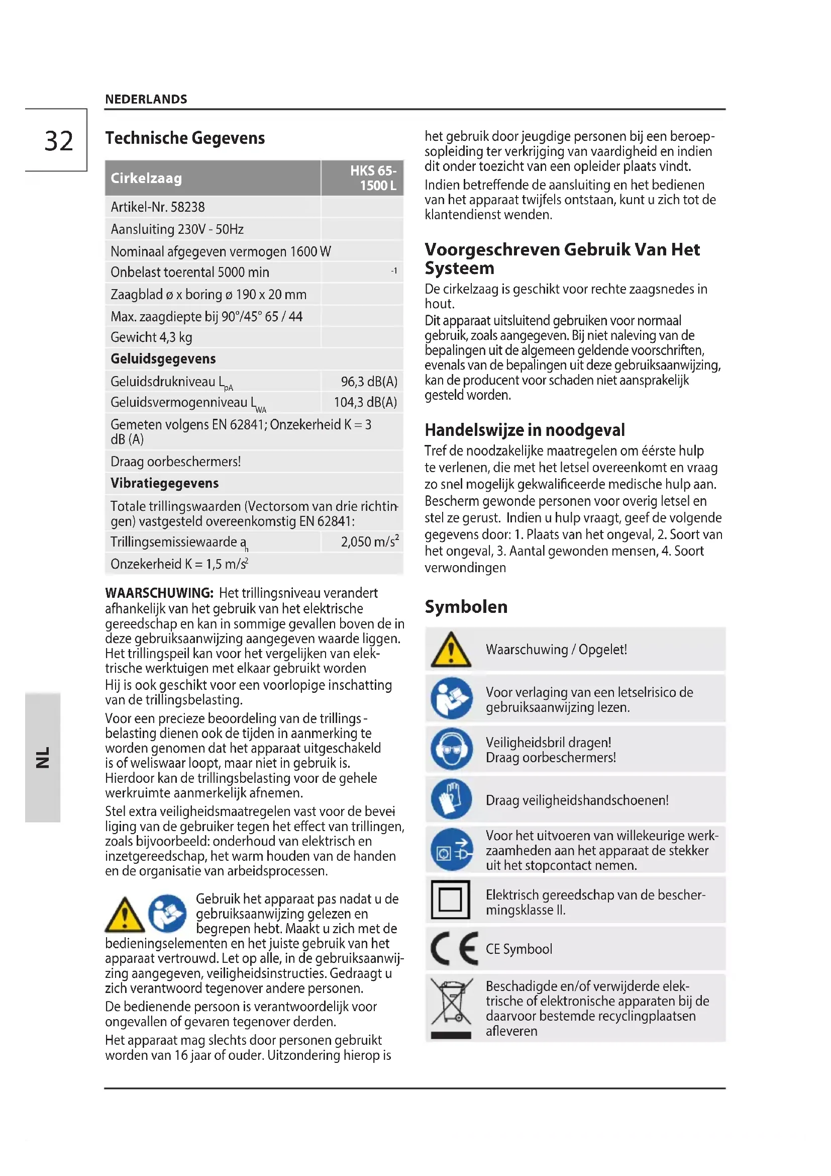 sopleiding ter verkrijging van vaardigheid en indien dit onder toezicht van een opleider plaats vindt. Indien betreende de aansluiting en het bedienen van het apparaat twijfels ontstaan, kunt u zich tot de klantendienst wenden. Voorgeschreven Gebruik Van Het Systeem De cirkelzaag is geschikt voor rechte zaagsnedes in hout. Dit apparaat uitsluitend gebruiken voor normaal gebruik, zoals aangegeven. Bij niet naleving van de bepalingen uit de algemeen geldende voorschriften, evenals van de bepalingen uit deze gebruiksaanwijzing, kan de producent voor schaden niet aansprakelijk gesteld worden. Handelswijze in noodgeval Tref de noodzakelijke maatregelen om éérste hulp teverlenen, die met het letsel overeenkomt en vraag zo snelmogelijk gekwaliceerde medische hulp aan. Beschermgewonde personen voor overig letsel en stel ze gerust. Indien u hulp vraagt, geef de volgende gegevens door: 1. Plaats van het ongeval, 2. Soort van het ongeval, 3. Aantal gewonden mensen, 4. Soort verwondingen Symbolen Waarschuwing / Opgelet! Voor verlaging van een letselrisico de gebruiksaanwijzing lezen. Veiligheidsbril dragen! Draag oorbeschermers! Draag veiligheidshandschoenen! Voor het uitvoeren van willekeurige werk- zaamheden aan het apparaat de stekker uit het stopcontact nemen. Elektrisch gereedschap van de bescher- mingsklasse II. CE Symbool Beschadigde en/of verwijderde elek- trische of elektronische apparaten bij de daarvoor bestemde recyclingplaatsen aeverenD