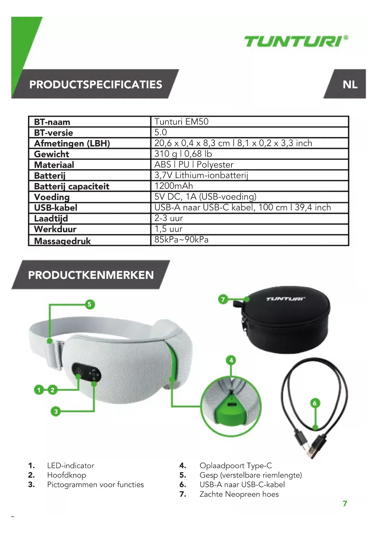 20,6 x 0,4 x 8,3 cm | 8,1 x 0,2 x 3,3 inch 310 g | 0,68 lb ABS | PU | Polyester 3,7V Lithium-ionbatterij 1200mAh 5V DC, 1A (USB-voeding) USB-A naar USB-C kabel, 100 cm | 39,4 inch 2-3 uur 1,5 uur 85kPa~90kPa BT-naam BT-versie Afmetingen (LBH) Gewicht Materiaal Batterij Batterij capaciteit Voeding USB-kabel Laadtijd Werkduur Massagedruk LED-indicator Hoofdknop Pictogrammen voor functies Oplaadpoort Type-C Gesp (verstelbare riemlengte) USB-A naar USB-C-kabel Zachte Neopreen hoes