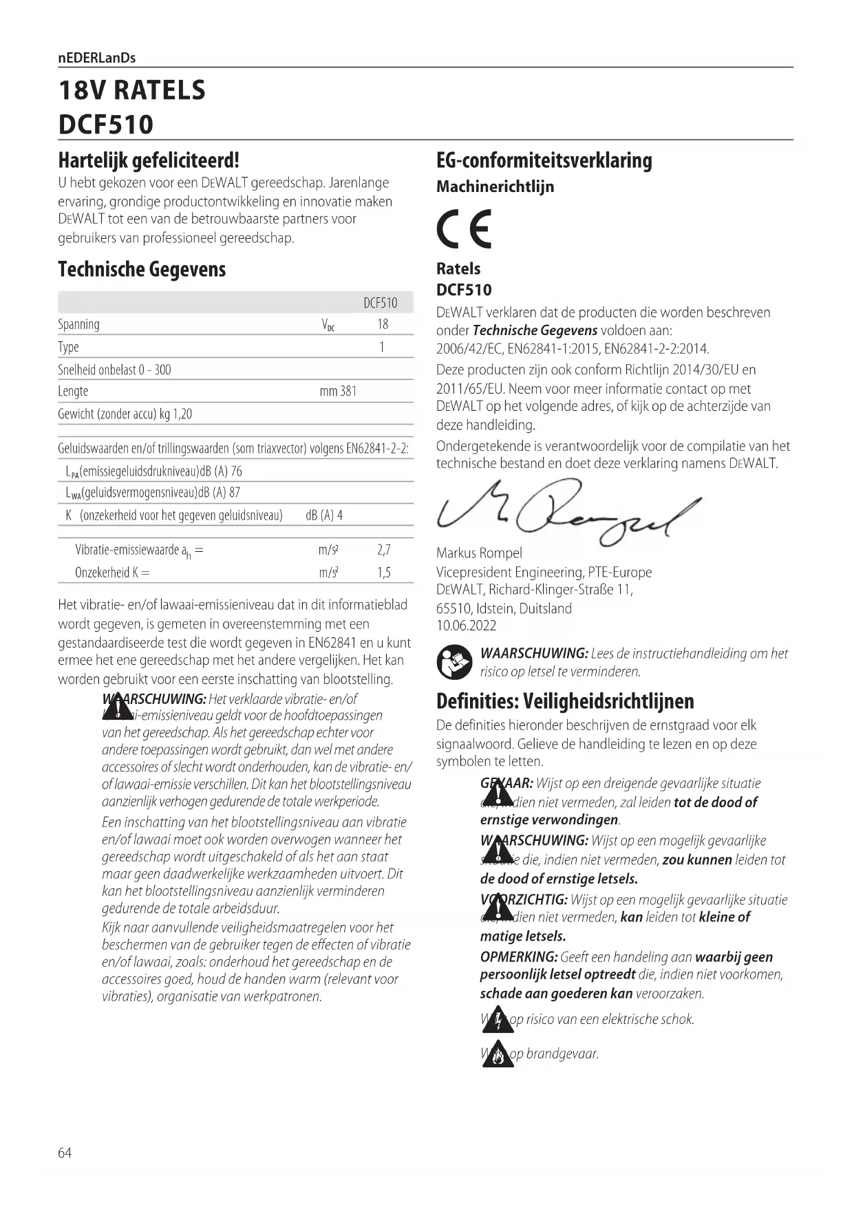per sbloccare gli elementi di fissaggio più ostinati o per effettuare il serraggio “di avvicinamento”, rilasciando il grilletto e applicando la coppia di serraggio amano. NOTA: una coppia di serraggio eccessiva applicata manualmente potrebbe danneggiare l'albero se dovesse superare il limite di 101Nm.64 nEDERLanDs WAARSCHUWING: Lees de instructiehandleiding om het risico op letsel teverminderen. Definities: Veiligheidsrichtlijnen De definities hieronder beschrijven de ernstgraad voor elk signaalwoord. Gelieve de handleiding te lezen en op deze symbolen teletten. GEVAAR: Wijst op een dreigende gevaarlijke situatie die, indien niet vermeden, zal leiden tot de dood of ernstigeverwondingen. WAARSCHUWING: Wijst op een mogelijk gevaarlijke situatie die, indien niet vermeden, zou kunnen leiden tot de dood of ernstigeletsels. VOORZICHTIG: Wijst op een mogelijk gevaarlijke situatie die, indien niet vermeden, kan leiden tot kleine of matigeletsels. OPMERKING: Geeft een handeling aan waarbij geen persoonlijk letsel optreedt die, indien niet voorkomen, schade aan goederen kanveroorzaken. Wijst op risico van een elektrischeschok. Wijst opbrandgevaar. EG‑conformiteitsverklaring Machinerichtlijn Ratels DCF510 DeWALT verklaren dat de producten die worden beschreven onder Technische Gegevens voldoen aan: 2006/42/EC, EN62841‑1:2015, EN62841‑2‑2:2014.Deze producten zijn ook conform Richtlijn 2014/30/EU en 2011/65/EU. Neem voor meer informatie contact op met DeWALT op het volgende adres, of kijk op de achterzijde van dezehandleiding.Ondergetekende is verantwoordelijk voor de compilatie van het technische bestand en doet deze verklaring namensDeWALT.Markus Rompel Vicepresident Engineering, PTE‑Europe DeWALT, Richard‑Klinger‑Straße 11, 65510, Idstein, Duitsland 10.06.2022Het vibratie‑ en/of lawaai‑emissieniveau dat in dit informatieblad wordt gegeven, is gemeten in overeenstemming met een gestandaardiseerde test die wordt gegeven in