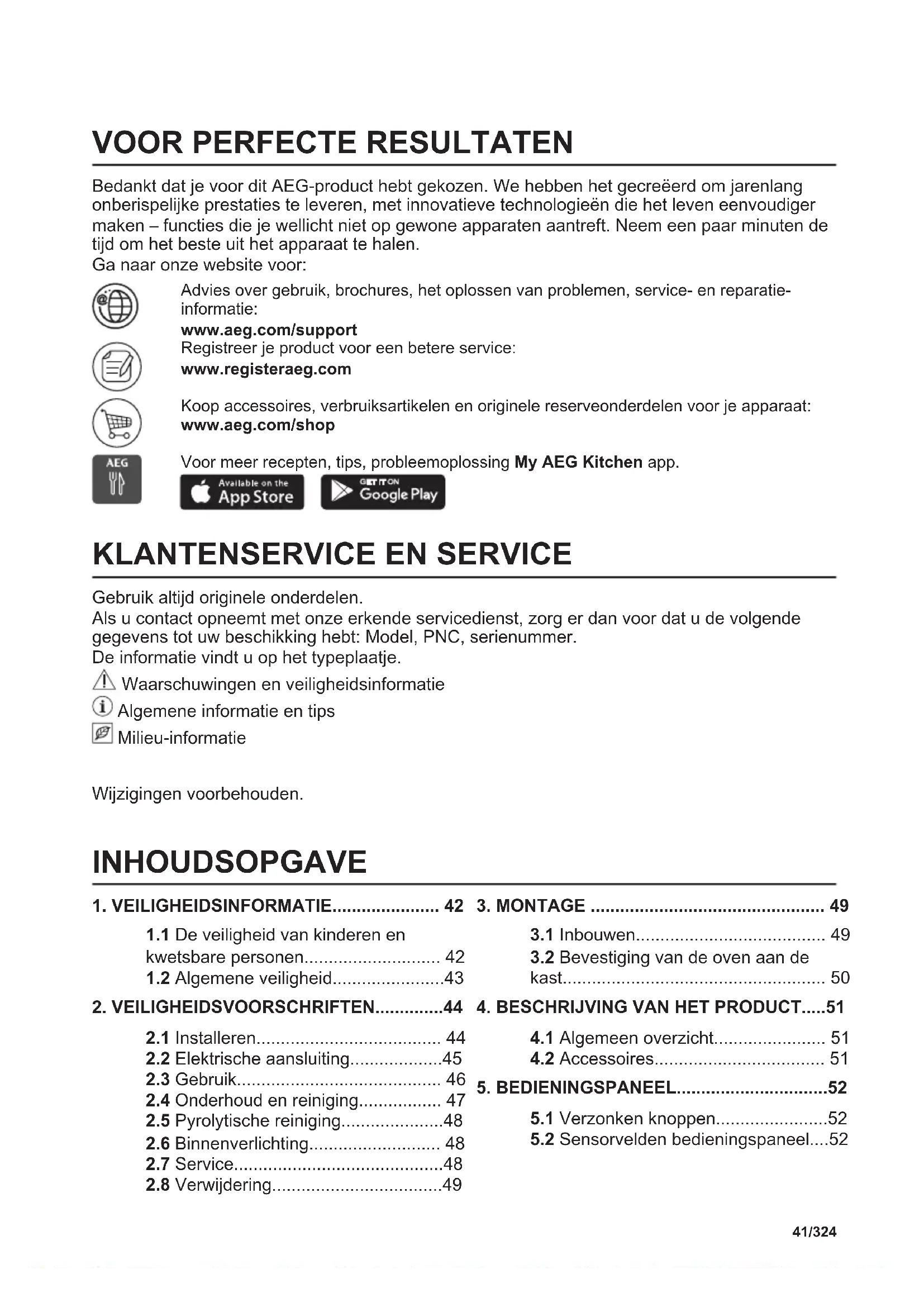 Bedankt dat je voor dit AEG-product hebt gekozen. We hebben het gecreëerd om jarenlang onberispelijke prestaties te leveren, met innovatieve technologieën die het leven eenvoudiger maken – functies die je wellicht niet op gewone apparaten aantreft. Neem een paar minuten de tijd om het beste uit het apparaat te halen. Ga naar onze website voor: Advies over gebruik, brochures, het oplossen van problemen, service- en reparatie- informatie: www.aeg.com/support Registreer je product voor een betere service: www.registeraeg.com Koop accessoires, verbruiksartikelen en originele reserveonderdelen voor je apparaat: www.aeg.com/shop Voor meer recepten, tips, probleemoplossing My AEG Kitchen app.