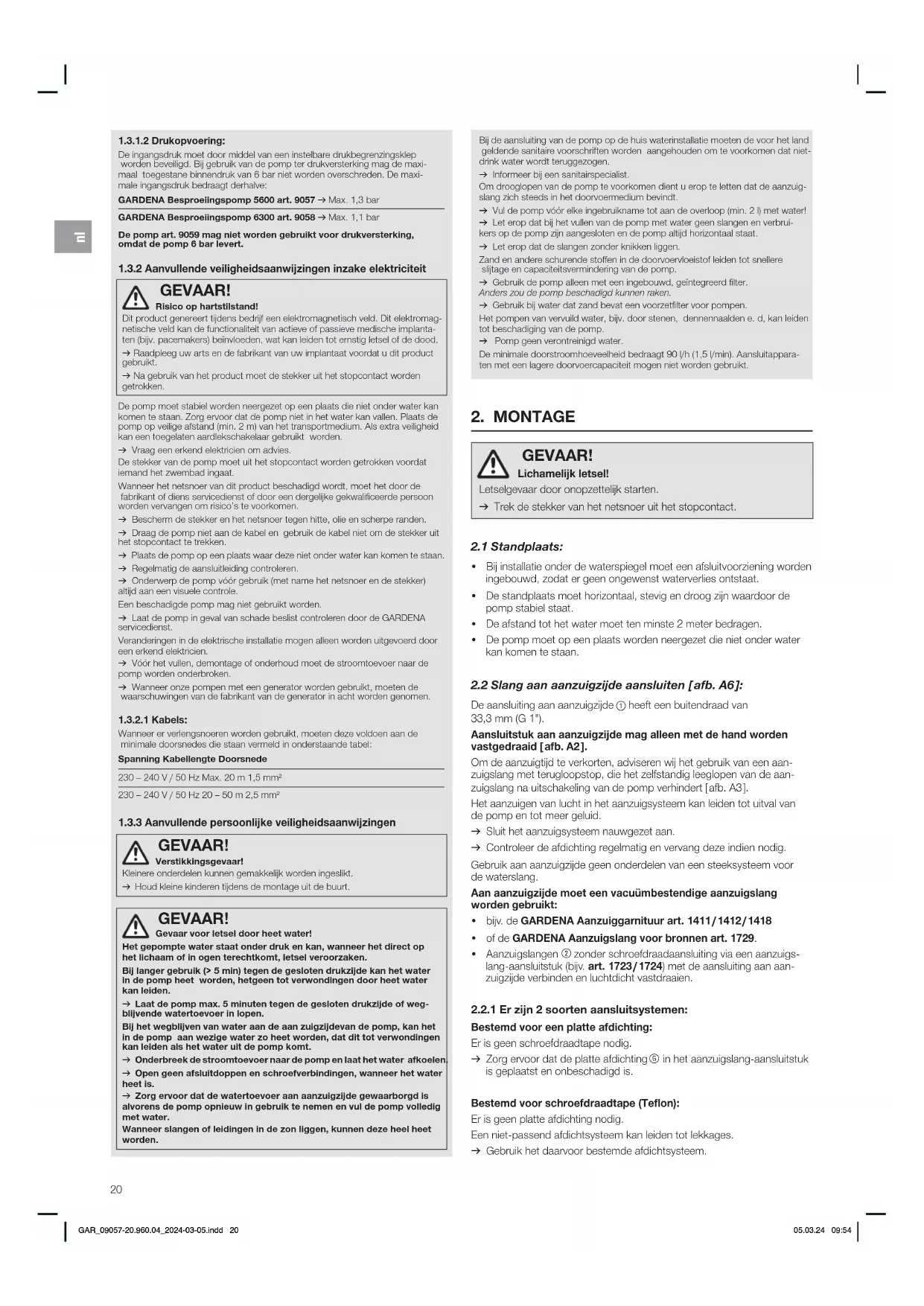 1.3.1.2 Drukopvoering:De ingangsdruk moet door middel van een instelbare drukbegrenzingsklep worden beveiligd. Bij gebruik van de pomp ter drukversterking mag de maxi-maal toegestane binnendruk van 6 bar niet worden overschreden. De maxi-maleingangsdruk bedraagt derhalve:GARDENA Besproeiingspomp 5600 art. 9057 v Max. 1,3 barGARDENA Besproeiingspomp 6300 art. 9058 v Max. 1,1 barDe pomp art. 9059 mag niet worden gebruikt voor drukversterking, omdat de pomp 6 bar levert.1.3.2 Aanvullende veiligheidsaanwijzingen inzake elektriciteit GEVAAR! Risico op hartstilstand!Dit product genereert tijdens bedrijf een elektromagnetisch veld. Dit elektromag-netische veld kan de functionaliteit van actieve of passieve medische implanta-ten(bijv. pacemakers) beïnvloeden, wat kan leiden tot ernstig letsel of de dood. v Raadpleeg uw arts en de fabrikant van uw implantaat voordat u dit product gebruikt. v Na gebruik van het product moet de stekker uit het stopcontact worden getrokken.De pomp moet stabiel worden neergezet op een plaats die niet onder water kan komen te staan. Zorg ervoor dat de pomp niet in het water kan vallen. Plaats de pomp op veilige afstand (min. 2 m) van het transportmedium. Als extra veiligheid kan een toegelaten aardlekschakelaar gebruikt worden.v Vraag een erkend elektricien om advies.De stekker van de pomp moet uit het stopcontact worden getrokken voordat iemand het zwembad ingaat.Wanneer het netsnoer van dit product beschadigd wordt, moet het door de fabrikant of diens servicedienst of door een dergelijke gekwalificeerde persoon worden vervangen om risico’s te voorkomen.v Bescherm de stekker en het netsnoer tegen hitte, olie en scherpe randen.v Draag de pomp niet aan de kabel en gebruik de kabel niet om de stekker uit het stopcontact te trekken.v Plaats de pomp op een plaats waar deze niet onder water kan komen te staan.v Regelmatig de aansluitleiding controleren.v Onderwerp de pomp vóór gebruik (met name het netsnoer en de stekker) altijd aan een visuele controle.Een beschadigde pomp mag niet gebruikt worden.v Laat de pomp in geval van schade beslist controleren door de GARDENA servicedienst.Veranderingen in de elektrische installatie mogen alleen worden uitgevoerd door een erkend elektricien.v Vóór het vullen, demontage of onderhoud moet de stroomtoevoer naar de pomp worden onderbroken.v Wanneer onze pompen met een generator worden gebruikt, moeten de waarschuwingen van de fabrikant van de generator in acht worden genomen.1.3.2.1 Kabels:Wanneer er verlengsnoeren worden gebruikt, moeten deze voldoen aan de minimale doorsnedes die staan vermeld in onderstaande tabel:Spanning Kabellengte Doorsnede230 – 240 V / 50 Hz Max. 20 m 1,5 mm²230 – 240 V / 50 Hz 20 – 50 m 2,5 mm²1.3.3 Aanvullende persoonlijke veiligheidsaanwijzingen GEVAAR!Verstikkingsgevaar!Kleinere onderdelen kunnen gemakkelijk worden ingeslikt. v Houd kleine kinderen tijdens de montage uit de buurt. GEVAAR!Gevaar voor letsel door heet water!Het gepompte water staat onder druk en kan, wanneer het direct op het lichaam of in ogen terechtkomt, letsel veroorzaken.Bij langer gebruik (> 5 min) tegen de gesloten drukzijde kan het water in de pomp heet worden, hetgeen tot verwondingen door heet water kan leiden. v Laat de pomp max. 5 minuten tegen de gesloten drukzijde of weg-blijvende watertoevoer in lopen.Bij het wegblijven van water aan de aan zuigzijdevan de pomp, kan het in de pomp aan wezige water zo heet worden, dat dit tot verwondingen kan leiden als het water uit de pomp komt.v Onderbreek de stroomtoevoer naar de pomp en laat het water afkoelen.v Open geen afsluitdoppen en schroefverbindingen, wanneer het water heet is.v Zorg ervoor dat de watertoevoer aan aanzuigzijde gewaarborgd is alvorens de pomp opnieuw in gebruik te nemen en vul de pomp volledig met water.Wanneer slangen of leidingen in de zon liggen, kunnen deze heel heet worden.Bij de aansluiting van de pomp op de huis waterinstallatie moeten de voor het land geldende sanitaire voorschriften worden aangehouden om te voorkomen dat niet-drink water wordt teruggezogen.v Informeer bij een sanitairspecialist.Om drooglopen van de pomp te voorkomen dient u erop te letten dat de aanzuig-slang zich steeds in het doorvoermedium bevindt.v Vul de pomp vóór elke ingebruikname tot aan de overloop (min. 2 l) met water!v Let erop dat bij het vullen van de pomp met water geen slangen en verbrui-kers op de pomp zijn aangesloten en de pomp altijd horizontaal staat.v Let erop dat de slangen zonder knikken liggen.Zand en andere schurende stoffen in de doorvoervloeistof leiden tot snellere slijtage en capaciteitsvermindering van de pomp.v Gebruik de pomp alleen met een ingebouwd, geïntegreerd filter. Anders zou de pomp beschadigd kunnen raken.v Gebruik bij water dat zand bevat een voorzetfilter voor pompen.Het pompen van vervuild water, bijv. door stenen, dennennaalden e. d, kan leiden tot beschadiging van de pomp.v Pomp geen verontreinigd water.De minimale doorstroomhoeveelheid bedraagt 90 l/h (1,5 l/min). Aansluitappara-ten met een lagere doorvoercapaciteit mogen niet worden gebruikt.