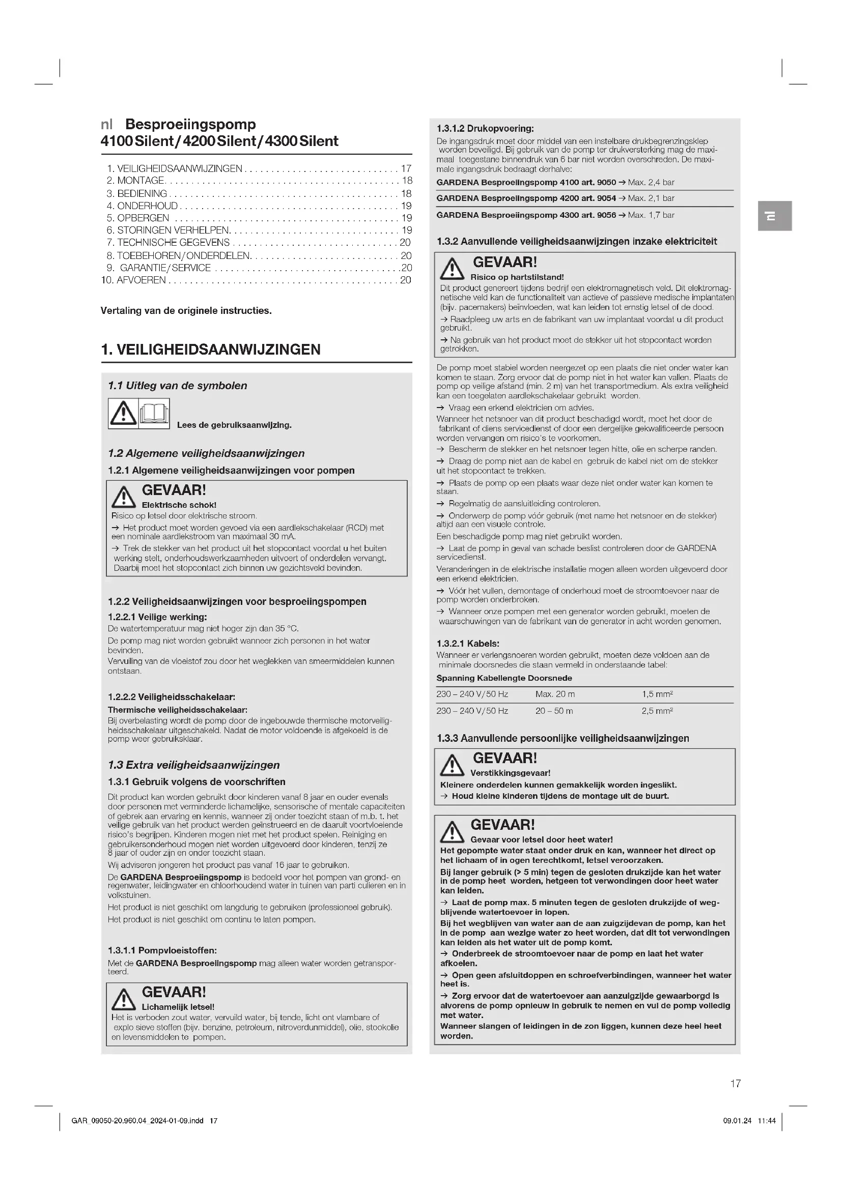 GEVAAR!Risico op hartstilstand!Dit product genereert tijdens bedrijf een elektromagnetisch veld. Dit elektromag-netische veld kan de functionaliteit van actieve of passieve medische implantaten (bijv. pacemakers) beïnvloeden, wat kan leiden tot ernstig letsel of de dood. v Raadpleeg uw arts en de fabrikant van uw implantaat voordat u dit product gebruikt. v Na gebruik van het product moet de stekker uit het stopcontact worden getrokken.De pomp moet stabiel worden neergezet op een plaats die niet onder water kan komen te staan. Zorg ervoor dat de pomp niet in het water kan vallen. Plaats de pomp op veilige afstand (min. 2 m) van het transportmedium. Als extra veiligheid kan een toegelaten aardlekschakelaar gebruikt worden.v Vraag een erkend elektricien om advies.Wanneer het netsnoer van dit product beschadigd wordt, moet het door de fabrikant of diens servicedienst of door een dergelijke gekwalificeerde persoon worden vervangen om risico’s te voorkomen.v Bescherm de stekker en het netsnoer tegen hitte, olie en scherpe randen.v Draag de pomp niet aan de kabel en gebruik de kabel niet om de stekker uit het stopcontact te trekken.v Plaats de pomp op een plaats waar deze niet onder water kan komen te staan.v Regelmatig de aansluitleiding controleren.v Onderwerp de pomp vóór gebruik (met name het netsnoer en de stekker) altijd aan een visuele controle.Een beschadigde pomp mag niet gebruikt worden.v Laat de pomp in geval van schade beslist controleren door de GARDENA servicedienst.Veranderingen in de elektrische installatie mogen alleen worden uitgevoerd door een erkend elektricien.v Vóór het vullen, demontage of onderhoud moet de stroomtoevoer naar de pomp worden onderbroken.v Wanneer onze pompen met een generator worden gebruikt, moeten de waarschuwingen van de fabrikant van de generator in acht worden genomen.
