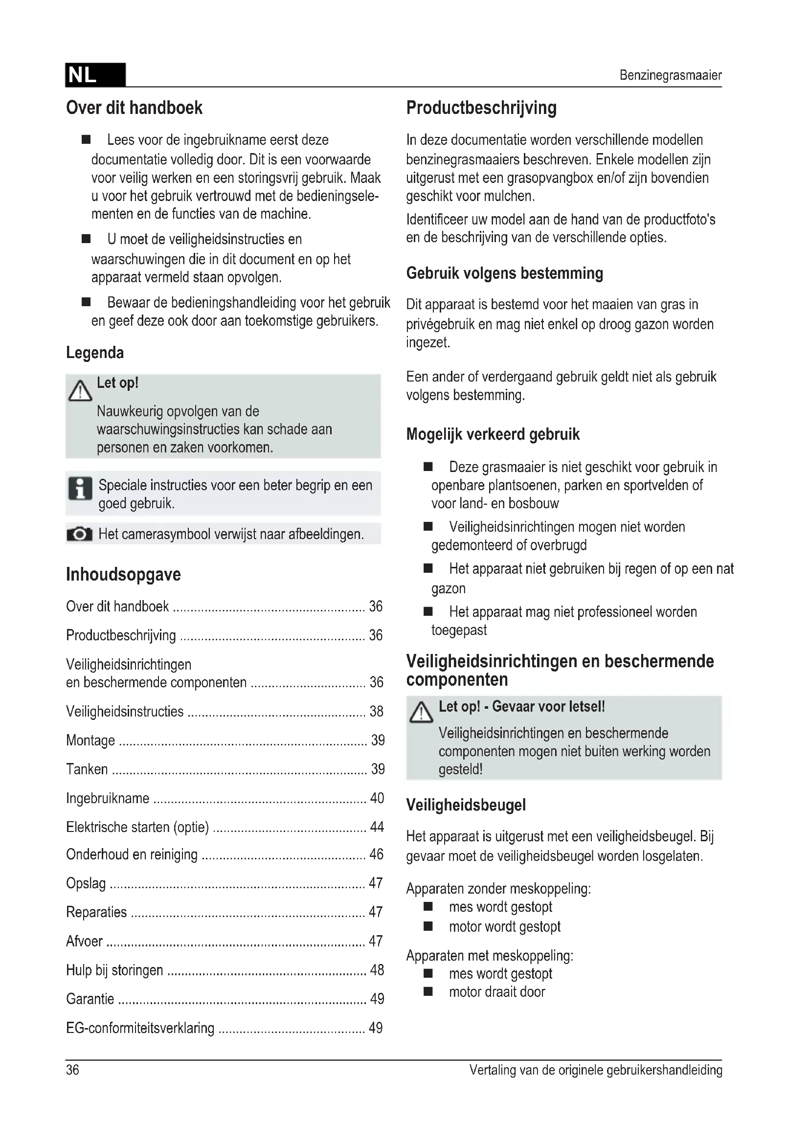 - Benzinegrasmaaier Inhoudsopgave Over dit handboek p. 36