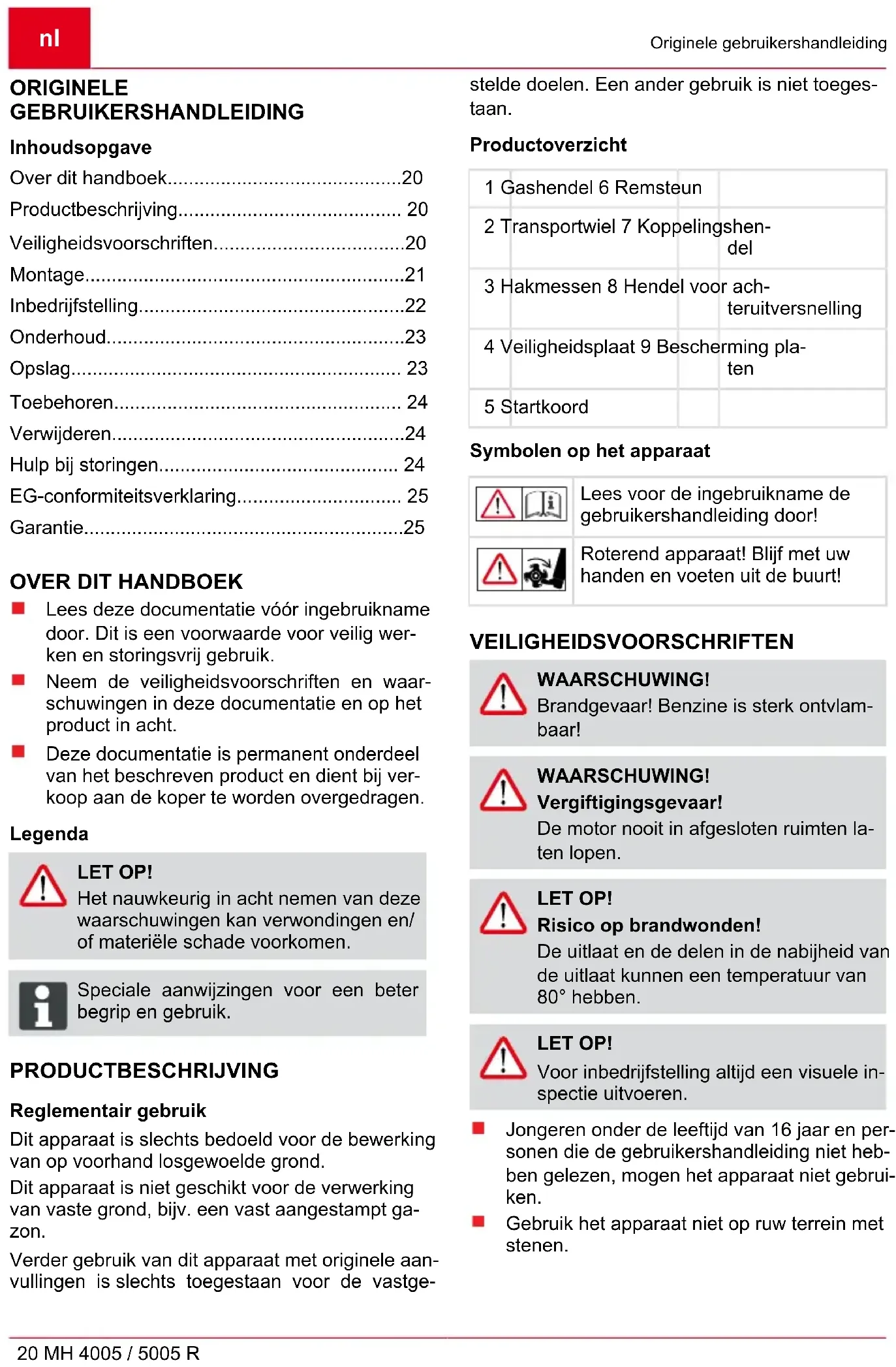 Lees deze documentatie vóór ingebruikname door. Dit is een voorwaarde voor veilig wer- ken en storingsvrij gebruik. Neem de veiligheidsvoorschriften en waar- schuwingen in deze documentatie en op het product in acht. Deze documentatie is permanent onderdeel van het beschreven product en dient bij ver- koop aan de koper te worden overgedragen. Legenda LET OP! Het nauwkeurig in acht nemen van deze waarschuwingen kan verwondingen en/ of materiële schade voorkomen. ADVICE Speciale aanwijzingen voor een beter begrip en gebruik. PRODUCTBESCHRIJVING Reglementair gebruik Dit apparaat is slechts bedoeld voor de bewerking van op voorhand losgewoelde grond. Dit apparaat is niet geschikt voor de verwerking van vaste grond, bijv. een vast aangestampt ga- zon. Verder gebruik van dit apparaat met originele aan- vullingen is slechts toegestaan voor de vastge- stelde doelen. Een ander gebruik is niet toeges- taan. Productoverzicht 1 Gashendel 6 Remsteun 2 Transportwiel 7 Koppelingshen- del 3 Hakmessen 8 Hendel voor ach- teruitversnelling 4 Veiligheidsplaat 9 Bescherming pla- ten 5 Startkoord Symbolen op het apparaat Lees voor de ingebruikname de gebruikershandleiding door! Roterend apparaat! Blijf met uw handen en voeten uit de buurt! VEILIGHEIDSVOORSCHRIFTEN WAARSCHUWING! Brandgevaar! Benzine is sterk ontvlam- baar! WAARSCHUWING! Vergiftigingsgevaar! De motor nooit in afgesloten ruimten la- ten lopen. LET OP! Risico op brandwonden! De uitlaat en de delen in de nabijheid van de uitlaat kunnen een temperatuur van 80° hebben. LET OP! Voor inbedrijfstelling altijd een visuele in- spectie uitvoeren. Jongeren onder de leeftijd van 16 jaar en per- sonen die de gebruikershandleiding niet heb- ben gelezen, mogen het apparaat niet gebrui- ken. Gebruik het apparaat niet op ruw terrein met stenen.Veiligheidsvoorschriften 441442_a 21 De plaatselijke regelgeving met betrekking tot de minimumleeftijd van de bedienende persoon in acht nemen. Geen loszittende kleding dragen Stevige, slipvrije schoenen dragen Vreemde voorwerpen uit het werkgebied ver- wijderen Het apparaat mag niet voor commercieel ge- bruik worden ingezet. De machine niet bedienen onder invloed van alcohol, drugs of medicatie. Neem de specifieke voorschriften voor de ge- bruikstijden in uw land in acht. Werk alleen bij voldoende daglicht of kunst- matige verlichting LET OP! Voor inbedrijfstelling altijd een visuele in- spectie uitvoeren. Het apparaat uitsluitend in technisch onberis- pelijke staat gebruiken Houd er rekening mee dat de gebruiker ver- antwoordelijk is bij ongevallen en schade, die andere personen of hun eigendommen be- treffen Veiligheids- en beschermingsvoorzieningen niet buiten werking stellen Blijf met uw handen en voeten uit de buurt van roterende onderdelen. Til of draag de machine nooit met lopende motor Let bij het werken op een zekere stand. De gebruiker is verantwoordelijk voor onge- vallen met andere mensen en hun eigendom- men. Laat het apparaat nooit zonder toezicht. Uitlaat en motor schoon houden Benzine alleen in daarvoor bestemde reser- voirs bewaren Alleen buiten tanken Beschadigde tank of tankdop vervangen Beschadigde of versleten onderdelen moe- ten worden vervangen door originele reser- veonderdelen. Wijzigingen in constructie en uitvoering blij- ven voorbehouden. Bij het starten van de motor mag niemand voor het apparaat of voor het werkinstrument (hakmessen) staan - de aandrijving van de hakmessen moet uitgeschakeld zijn. De montage en demontage van het transport- wiel en de bijstelling van de remsteun uitslui- tend bij uitgeschakelde motor en stilstaande hakmessen uitvoeren. Bij het rijden met gemonteerd transportwiel, de motor uitschakelen en wachten totdat de hakmessen stilstaan. Het gebruik van het apparaat is slechts toe- gestaan, als men zich houdt aan de veilige af- stand, die door de duwboom wordt bepaald. Altijd dwars ten opzichte van de helling wer- ken. Niet naar boven en naar beneden op de hel- ling werken en evenmin op hellingen met een inclinatie van meer dan 10°. Terwijl de motor loopt of het apparaat heet is, mag de sluiting van de brandstoftank niet ge- opend worden en mag er geen benzine bijge- vuld worden. Bij het tanken van brandstof een vultrechter of vulbuis gebruiken, om zo te voorkomen dat er brandstof wordt gemorst op de motor, de behuizing of op de ondergrond. Wanneer er benzine is gemorst/overgelopen, mag de motor niet worden gestart. Het appa- raat moet dan worden gereinigd en alle ben- zinedamp moet zijn vervlogen voordat een startpoging wordt gedaan. Uit veiligheidsoverwegingen, de motor nooit gebruiken met versleten of beschadigde on- derdelen. De onderdelen moeten worden vervangen en mogen nooit worden gerepa- reerd. Gebruik originele reserveonderdelen. Niet gelijkwaardige reserveonderdelen, kun- nen de motor beschadigen en uw veiligheid in gevaar brengen Een beschadigde uitlaatdemper vervangen. De afstellingen van de motor niet wijzigen. MONTAGE Montage van remsteun (2) De lange zijde van de remsteun (2-1) in het eindstuk van de arm op het frame steken en vastzetten door de greep (2-2) te draaien. Montage van transportwiel (3) Het transportwiel (3-1) dient om de motorhakfrees te transporteren. Het transportwiel (3-1) op de remsteun schui- ven en met behulp van de sterschroef (3-2) bevestigen.nl Montage 22 MH 4005 / 5005 R Tijdens het werk moet het transportwiel verwij- derd zijn: de vleugelschroef (3-2) losdraaien en het transportwiel wegnemen. Montage van duwboomhouder (4) De houder (4-1) met behulp van de reeds op de plaat aangebrachte 4 schroeven (4-2), de onderlegringen (4-3) en moeren (4-4) op de motorhakfrees monteren. De kabelinvoer (4-5) zoals op de afbeelding (4) monteren. Montage van duwboom (5) De 2 duwboomstangen (5-1) met behulp van doorsteekschroef (5-2), afstandsstuk (5-3), onderlegringen (5-4) en moeren (5-5) in het bovenste gat van de duwboom bevestigen. Dezelfde procedure voor het gat (5-9) door de andere schroef (5-2), afstandsstuk (5-3) en de onderlegringen 4 m