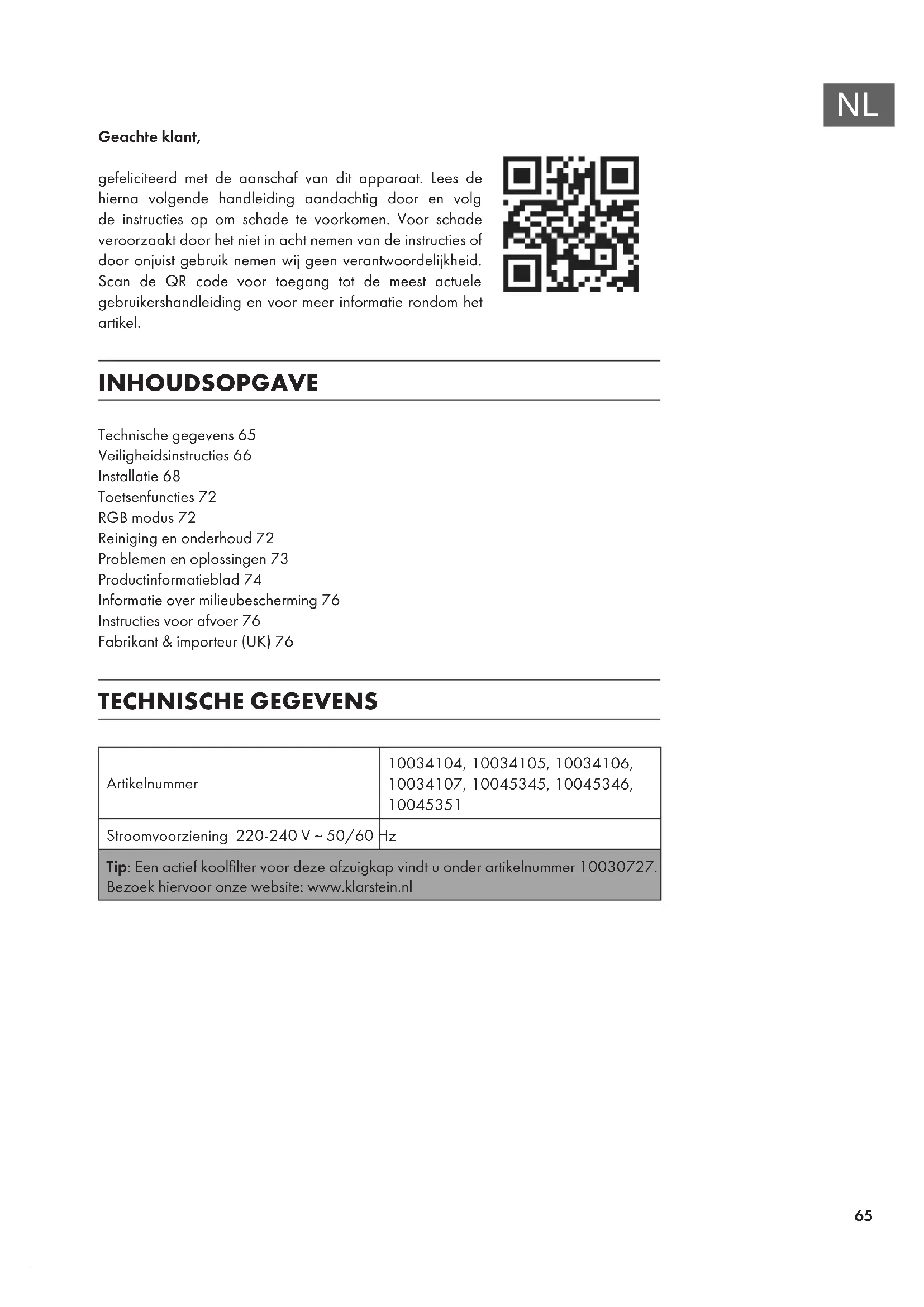 Geachte klant, gefeliciteerd met de aanschaf van dit apparaat. Lees de hierna volgende handleiding aandachtig door en volg de instructies op om schade te voorkomen. Voor schade veroorzaakt door het niet in acht nemen van de instructies of door onjuist gebruik nemen wij geen verantwoordelijkheid. Scan de QR code voor toegang tot de meest actuele gebruikershandleiding en voor meer informatie rondom het artikel. INHOUDSOPGAVE Technische gegevens 65 Veiligheidsinstructies 66 Installatie 68 Toetsenfuncties 72 RGB modus 72 Reiniging en onderhoud 72 Problemen en oplossingen 73 Productinformatieblad 74 Informatie over milieubescherming 76 Instructies voor afvoer 76 Fabrikant & importeur (UK) 76 TECHNISCHE GEGEVENS Artikelnummer 10034104, 10034105, 10034106, 10034107, 10045345, 10045346,