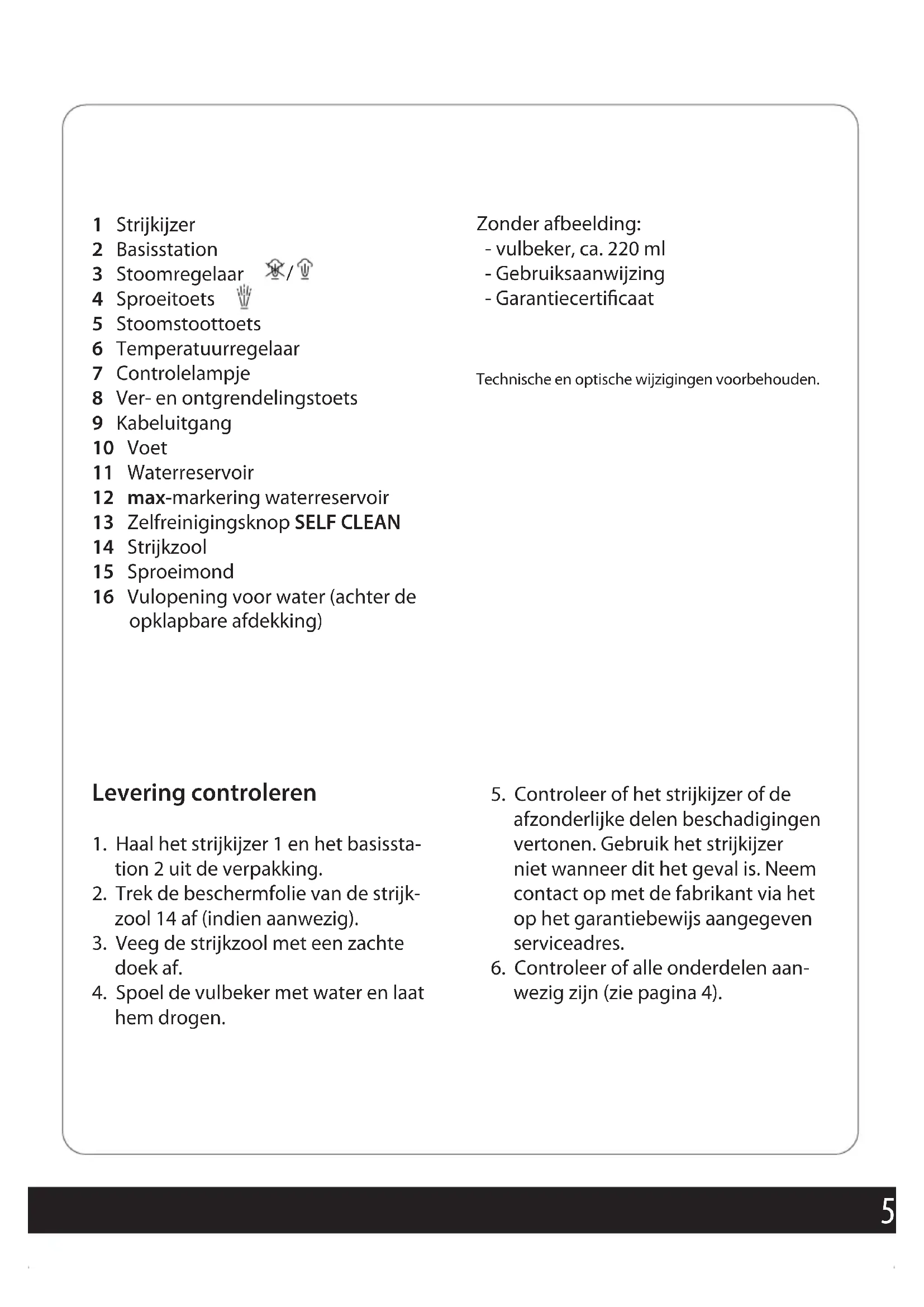 5 Stoomstoottoets 6 Temperatuurregelaar 7 Controlelampje 8 Ver- en ontgrendelingstoets 9 Kabeluitgang 10 Voet 11 Waterreservoir 12 max-markering waterreservoir 13 Zelfreinigingsknop SELF CLEAN 14 Strijkzool 15 Sproeimond 16 Vulopening voor water (achter de opklapbare afdekking) Zonder afbeelding: - vulbeker, ca. 220 ml - Gebruiksaanwijzing - Garantiecertificaat Technische en optische wijzigingen voorbehouden. Levering controleren