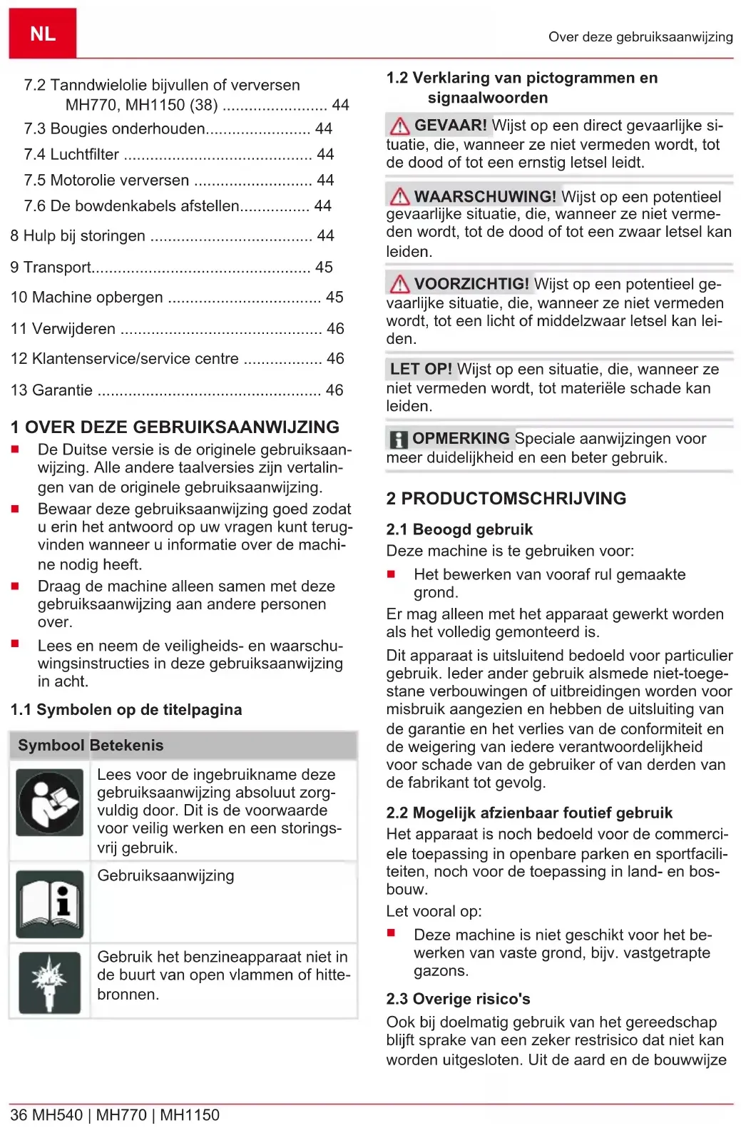 Het productoverzicht (01, 09, 18) geeft een over- zicht van de machine. Nr. Onderdeel 1 Koppelingshendel 2 DuwboomNL 38 MH540 | MH770 | MH1150 Veiligheidsinstructies Nr. Onderdeel 3 Versnellingshendel 4 Motor 5 Wiel 6 Hakmessen 7 Bescherming platen 8 Afschermkap 9 Remspoor 10 Gashendel 11 Hendel voor achteruitversnelling 12 Motorschakelaar 3 VEILIGHEIDSINSTRUCTIES GEVAAR! Levensgevaar en gevaar voor zeer ernstig letsel! Onbekendheid met de veilig- heidsinstructies en bedieningsinstructies kan bij- zonder ernstig letsel en zelfs de dood tot gevolg hebben.