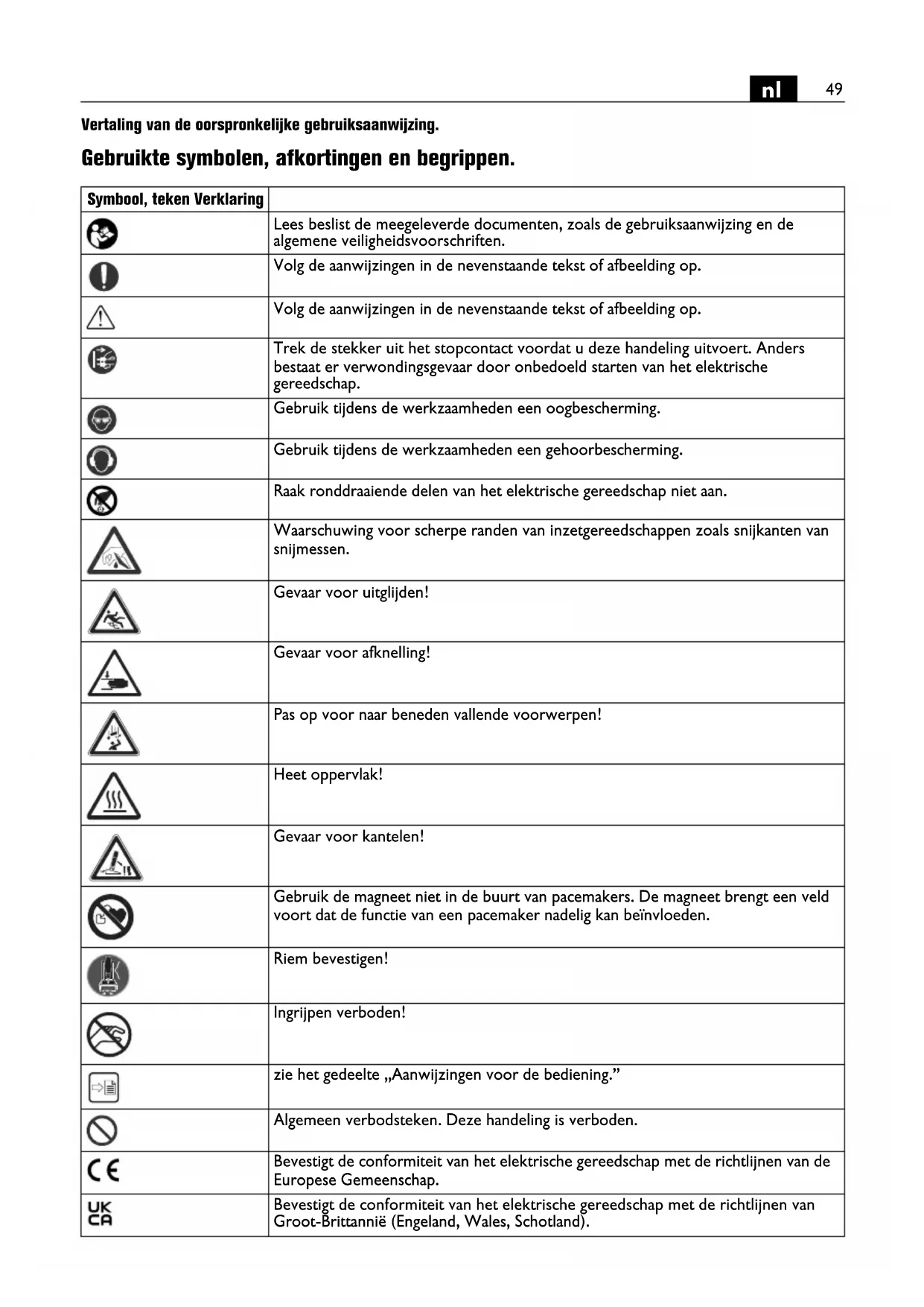 Vertaling van de oorspronkelijke gebruiksaanwijzing. Gebruikte symbolen, afkortingen en begrippen. Symbool, teken Verklaring Lees beslist de meegeleverde documenten, zoals de gebruiksaanwijzing en de algemene veiligheidsvoorschriften. Volg de aanwijzingen in de nevenstaande tekst of afbeelding op. Volg de aanwijzingen in de nevenstaande tekst of afbeelding op. Trek de stekker uit het stopcontact voordat u deze handeling uitvoert. Anders bestaat er verwondingsgevaar door onbedoeld starten van het elektrische gereedschap. Gebruik tijdens de werkzaamheden een oogbescherming. Gebruik tijdens de werkzaamheden een gehoorbescherming. Raak ronddraaiende delen van het elektrische gereedschap niet aan. Waarschuwing voor scherpe randen van inzetgereedschappen zoals snijkanten van snijmessen. Gevaar voor uitglijden! Gevaar voor afknelling! Pas op voor naar beneden vallende voorwerpen! Heet oppervlak! Gevaar voor kantelen! Gebruik de magneet niet in de buurt van pacemakers. De magneet brengt een veld voort dat de functie van een pacemaker nadelig kan beïnvloeden. Riem bevestigen! Ingrijpen verboden! zie het gedeelte „Aanwijzingen voor de bediening.” Algemeen verbodsteken. Deze handeling is verboden. Bevestigt de conformiteit van het elektrische gereedschap met de richtlijnen van de Europese Gemeenschap. Bevestigt de conformiteit van het elektrische gereedschap met de richtlijnen van Groot-Brittannië (Engeland, Wales, Schotland).50