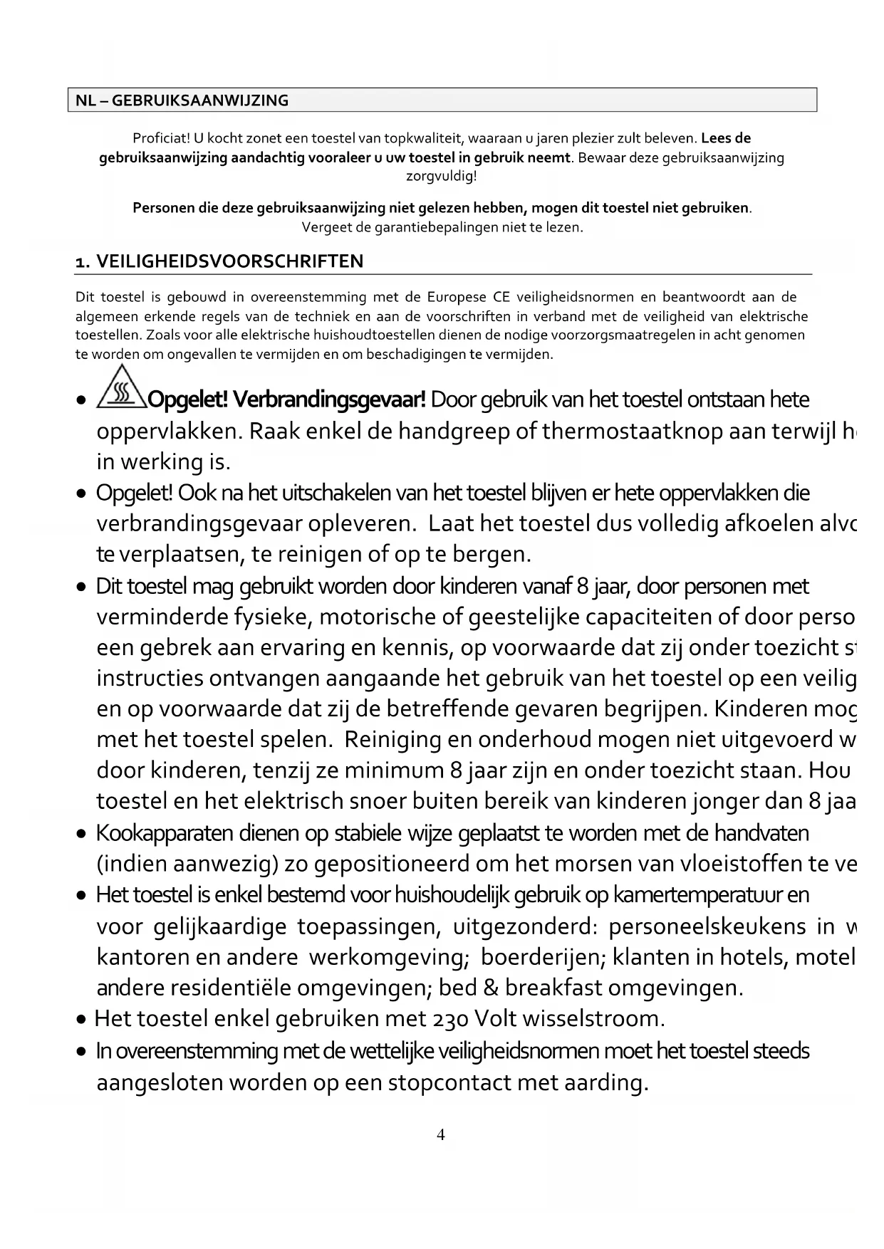 - Opgelet! Verbrandingsgevaar! Door gebruik van het toestel ontstaan hete oppervlakken. Raak enkel de handgreep of thermostaatknop aan terwijl het toestel in werking is.
