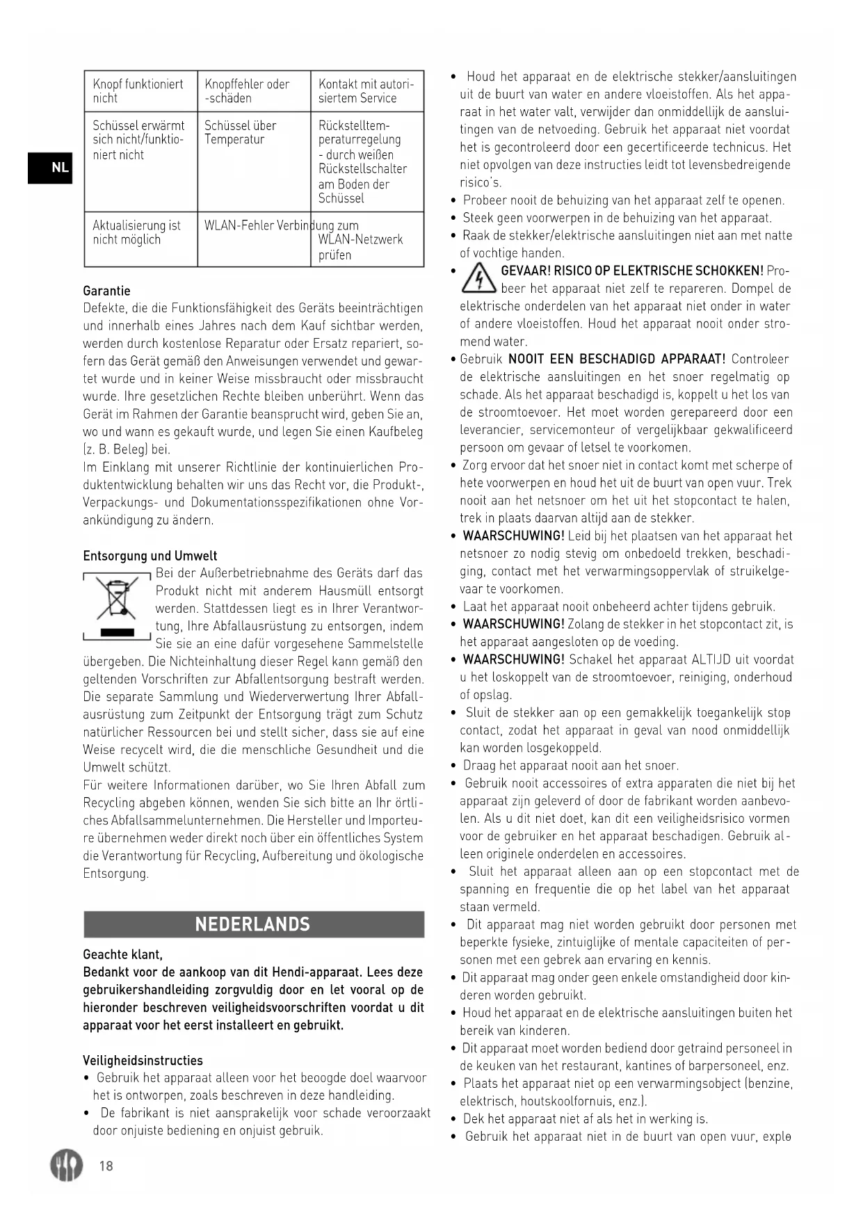 ches Abfallsammelunternehmen. Die Hersteller und Importeu- re übernehmen weder direkt noch über ein öffentliches System die Verantwortung für Recycling, Aufbereitung und ökologische Entsorgung. NEDERLANDS Geachte klant, Bedankt voor de aankoop van dit Hendi-apparaat. Lees deze gebruikershandleiding zorgvuldig door en let vooral op de hieronder beschreven veiligheidsvoorschriften voordat u dit apparaat voor het eerst installeert en gebruikt. Veiligheidsinstructies