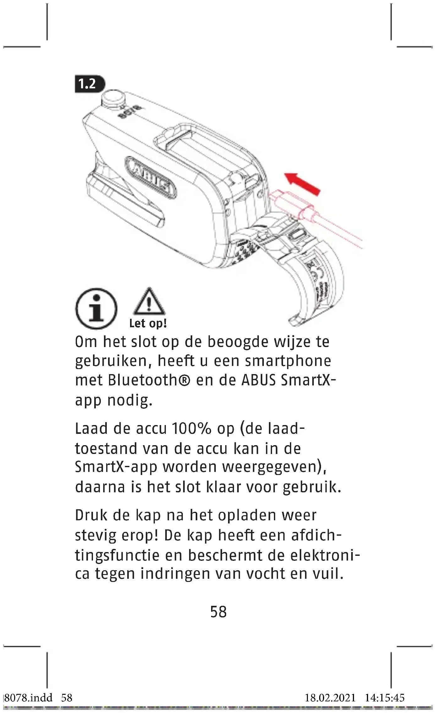 Let op! Om het slot op de beoogde wijze te gebruiken, hee u een smartphone met Bluetooth® en de ABUS SmartX- app nodig. Laad de accu 100% op (de laad- toestand van de accu kan in de SmartX-app worden weergegeven), daarna is het slot klaar voor gebruik. Druk de kap na het opladen weer stevig erop! De kap hee een afdich- tingsfunctie en beschermt de elektroni- ca tegen indringen van vocht en vuil. 8078.indd 588078.indd 58 18.02.2021 14:15:4518.02.2021 14:15:4559