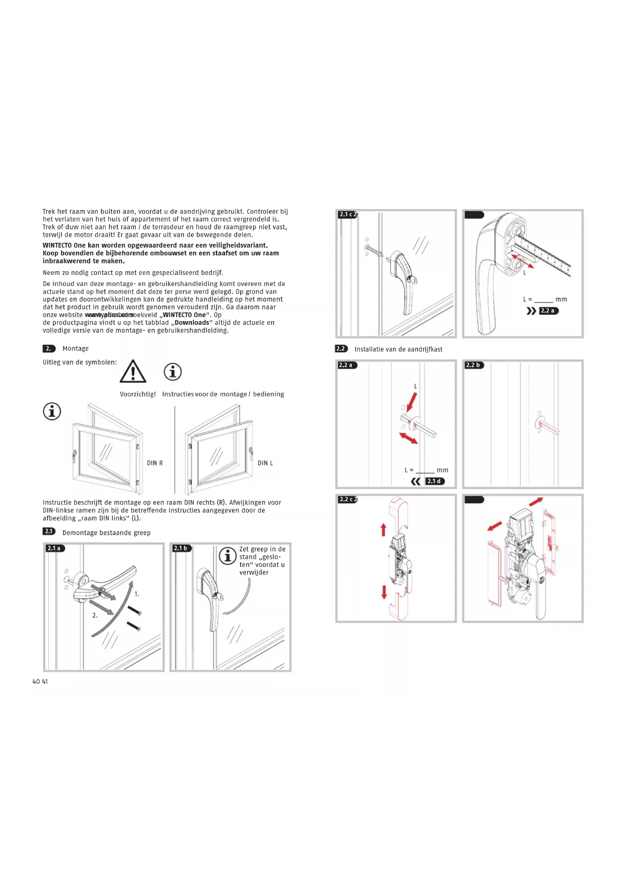Installatie van de aandrijast Trek het raam van buiten aan, voordat u de aandrijving gebruikt. Controleer bij het verlaten van het huis of appartement of het raam correct vergrendeld is. Trek of duw niet aan het raam / de terrasdeur en houd de raamgreep niet vast, terwijl de motor draait! Er gaat gevaar uit van de bewegende delen. WINTECTO One kan worden opgewaardeerd naar een veiligheidsvariant. Koop bovendien de bijbehorende ombouwset en een staafset om uw raam inbraakwerend te maken. Neem zo nodig contact op met een gespecialiseerd bedrijf. De inhoud van deze montage- en gebruikershandleiding komt overeen met de actuele stand op het moment dat deze ter perse werd gelegd. Op grond van updates en doorontwikkelingen kan de gedrukte handleiding op het moment dat het product in gebruik wordt genomen verouderd zijn. Ga daarom naar onze website en typ in het zoekveld „WINTECTO One“. Op de productpagina vindt u op het tabblad „Downloads“ altijd de actuele en volledige versie van de montage- en gebruikershandleiding.42 43 Let op de verschillende posities van DIN-rechtse en DIN-linkse ramen! Monteer de grondplaat en de vierkante sti zonder spanning in een hoek van 90° en schroef ze met de hand vast! Monteren van de greep