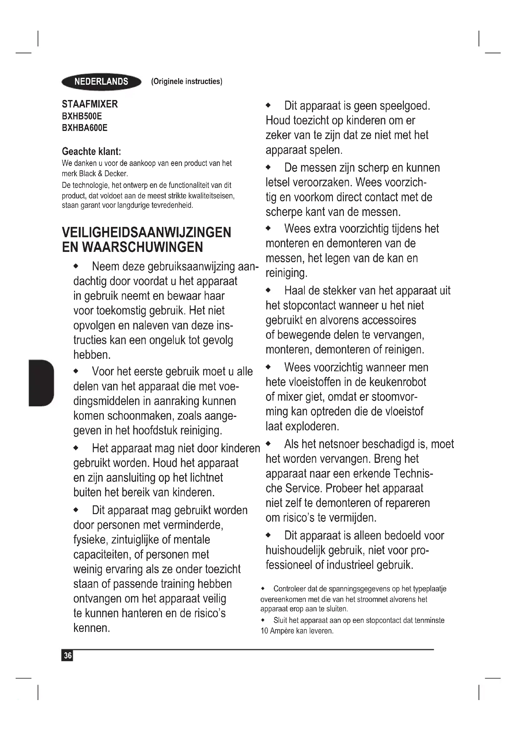 STAAFMIXER BXHB500E BXHBA600E Geachte klant: We danken u voor de aankoop van een product van het merk Black & Decker. De technologie, het ontwerp en de functionaliteit van dit product, dat voldoet aan de meest strikte kwaliteitseisen, staan garant voor langdurige tevredenheid. VEILIGHEIDSAANWIJZINGEN EN WAARSCHUWINGEN Neem deze gebruiksaanwijzing aan- dachtig door voordat u het apparaat in gebruik neemt en bewaar haar voor toekomstig gebruik. Het niet opvolgen en naleven van deze ins- tructies kan een ongeluk tot gevolg hebben. Voor het eerste gebruik moet u alle delen van het apparaat die met voe- dingsmiddelen in aanraking kunnen komen schoonmaken, zoals aange- geven in het hoofdstuk reiniging. Het apparaat mag niet door kinderen gebruikt worden. Houd het apparaat en zijn aansluiting op het lichtnet buiten het bereik van kinderen. Dit apparaat mag gebruikt worden door personen met verminderde, fysieke, zintuiglijke of mentale capaciteiten, of personen met weinig ervaring als ze onder toezicht staan of passende training hebben ontvangen om het apparaat veilig te kunnen hanteren en de risico’s kennen. Dit apparaat is geen speelgoed. Houd toezicht op kinderen om er zeker van te zijn dat ze niet met het apparaat spelen. De messen zijn scherp en kunnen letsel veroorzaken. Wees voorzich- tig en voorkom direct contact met de scherpe kant van de messen. Wees extra voorzichtig tijdens het monteren en demonteren van de messen, het legen van de kan en reiniging. Haal de stekker van het apparaat uit het stopcontact wanneer u het niet gebruikt en alvorens accessoires of bewegende delen te vervangen, monteren, demonteren of reinigen. Wees voorzichtig wanneer men hete vloeistoffen in de keukenrobot of mixer giet, omdat er stoomvor- ming kan optreden die de vloeistof laat exploderen. Als het netsnoer beschadigd is, moet het worden vervangen. Breng het apparaat naar een erkende Technis- che Service. Probeer het apparaat niet zelf te demonteren of repareren om risico’s te vermijden. Dit apparaat is alleen bedoeld voor huishoudelijk gebruik, niet voor pro- fessioneel of industrieel gebruik. Controleer dat de spanningsgegevens op het typeplaatje overeenkomen met die van het stroomnet alvorens het apparaat erop aan te sluiten. Sluit het apparaat aan op een stopcontact dat tenminste 10 Ampère kan leveren.NEDERLANDS (Originele instructies)