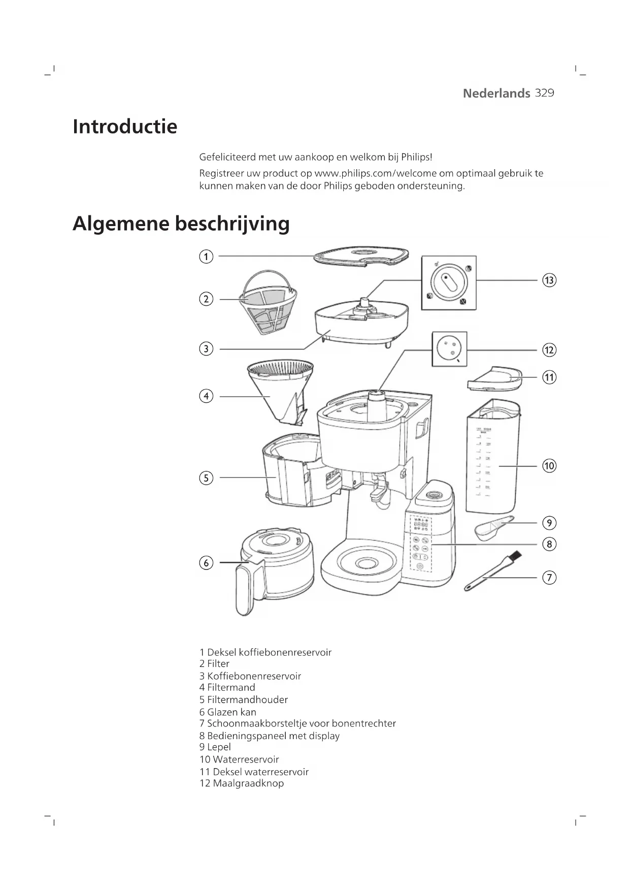 1 Deksel koffiebonenreservoir 2 Filter 3 Koffiebonenreservoir 4 Filtermand 5 Filtermandhouder 6 Glazen kan 7 Schoonmaakborsteltje voor bonentrechter 8 Bedieningspaneel met display 9 Lepel 10 Waterreservoir 11 Deksel waterreservoir 12 Maalgraadknop330 Nederlands 13 Reservoirselectieknop Bedieningspaneel Aan-uitknop Timerknop en pijltjestoets om de tijd aan te passen Start-/stopknop Reinigingsknop Knop voor voorgemalen koffie en koffiesterkte Selectieknoppen voor koppen Pictogram op display Aantal koppen Warmhoudmodus Voorgemalen koffie Koffiesterkte Ontkalken Waarschuwing handmatig reinigen331 Nederlands Laag waterniveau Timer Tijdsweergave De eerste twee cijfers geven het uur aan en de laatste twee cijfers de minuten. Draai de knop naar de ontgrendelde positie en verwijder het koffiebonenreservoir uit het apparaat. Met deze knop kunt u de maalgraad selecteren, waarbij een hogere graad voor een grovere maling zorgt. Kanmodus De druppelstopfunctie is actief in de kanmodus. Opmerking: het koffiezetproces stopt niet wanneer u de kan verwijdert. Als u de kan niet binnen twintig seconden terugzet in het apparaat, loopt de filtermand over. Kopmodus Schakel de knop handmatig over van kopmodus naar kanmodus om de druppelstop te activeren, zodat het druppelen stopt wanneer het koffiezetproces is afgerond. Opmerking: koude, keramische koppen nemen warmte van de koffie op. Voorkom dit door de koppen voor te verwarmen met heet water. Belangrijk Waarschuwing