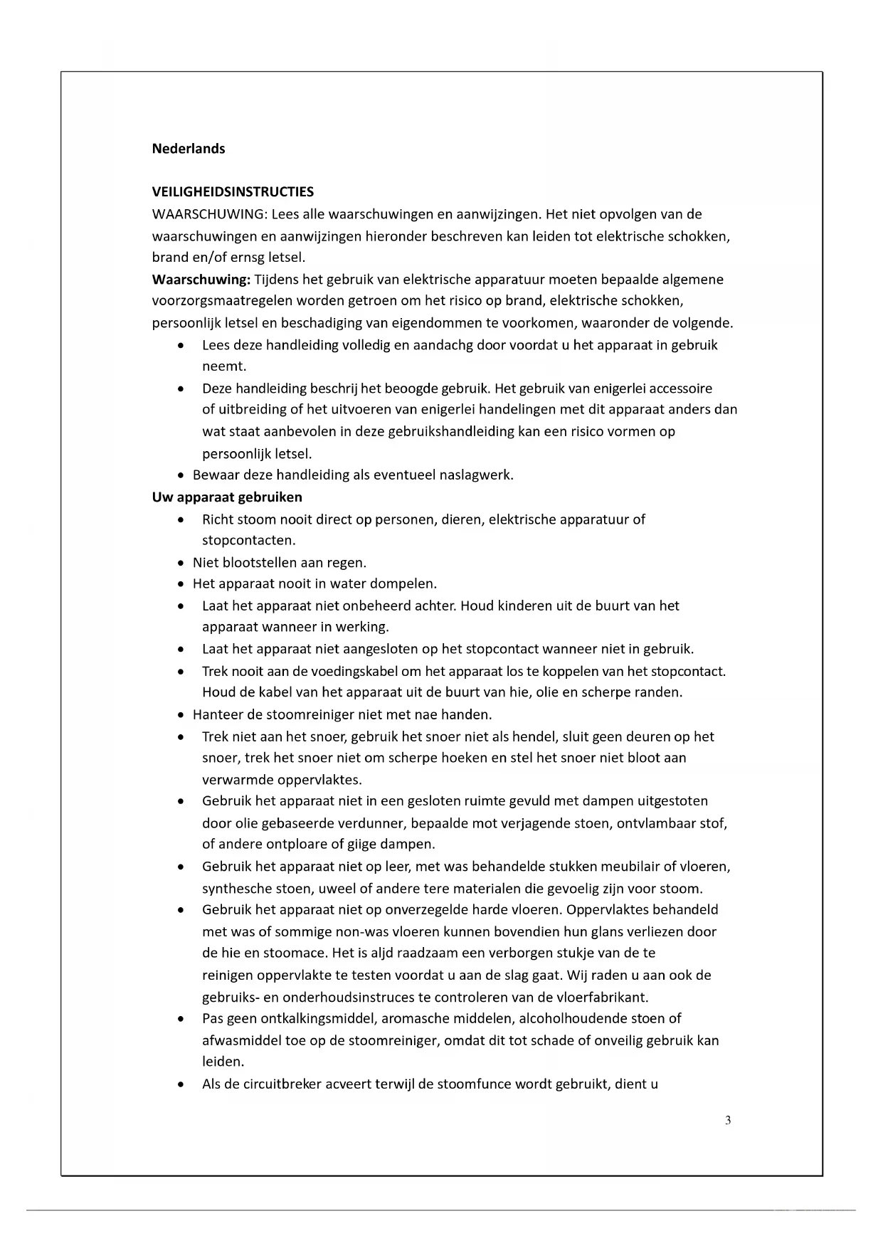 - Français Nederlands VEILIGHEIDSINSTRUCTIES WAARSCHUWING: Lees alle waarschuwingen en aanwijzingen. Het niet opvolgen van de waarschuwingen en aanwijzingen hieronder beschreven kan leiden tot elektrische schokken, brand en/of ernstig letsel. Waarschuwing: Tijdens het gebruik van elektrische apparatuur moeten bepaalde algemene voorzorgsmaatregelen worden getroffen om het risico op brand, elektrische schokken, persoonlijk letsel en beschadiging van eigendommen te voorkomen, waaronder de volgende. Lees deze handleiding volledig en aandachtig door voordat u het apparaat in gebruik neemt. Deze handleiding beschrijft het beoogde gebruik. Het gebruik van enigerlei accessoire of uitbreiding of het uitvoeren van enigerlei handelingen met dit apparaat anders dan wat staat aanbevolen in deze gebruikshandleiding kan een risico vormen op persoonlijk letsel. Bewaar deze handleiding als eventueel naslagwerk. Uw apparaat gebruiken Richt stoom nooit direct op personen, dieren, elektrische apparatuur of stopcontacten. Niet blootstellen aan regen. Het apparaat nooit in water dompelen. Laat het apparaat niet onbeheerd achter. Houd kinderen uit de buurt van het apparaat wanneer in werking. Laat het apparaat niet aangesloten op het stopcontact wanneer niet in gebruik. Trek nooit aan de voedingskabel om het apparaat los te koppelen van het stopcontact. Houd de kabel van het apparaat uit de buurt van hitte, olie en scherpe randen. Hanteer de stoomreiniger niet met natte handen. Trek niet aan het snoer, gebruik het snoer niet als hendel, sluit geen deuren op het snoer, trek het snoer niet om scherpe hoeken en stel het snoer niet bloot aan verwarmde oppervlaktes. Gebruik het apparaat niet in een gesloten ruimte gevuld met dampen uitgestoten door olie gebaseerde verdunner, bepaalde mot verjagende stoffen, ontvlambaar stof, of andere ontplofbare of giftige dampen. Gebruik het apparaat niet op leer, met was behandelde stukken meubilair of vloeren, synthetische stoffen, fluweel of andere tere materialen die gevoelig zijn voor stoom. Gebruik het apparaat niet op onverzegelde harde vloeren. Oppervlaktes behandeld met was of sommige non-was vloeren kunnen bovendien hun glans verliezen door de hitte en stoomactie. Het is altijd raadzaam een verborgen stukje van de te reinigen oppervlakte te testen voordat u aan de slag gaat. Wij raden u aan ook de gebruiks- en onderhoudsinstructies te controleren van de vloerfabrikant. Pas geen ontkalkingsmiddel, aromatische middelen, alcoholhoudende stoffen of afwasmiddel toe op de stoomreiniger, omdat dit tot schade of onveilig gebruik kan leiden. Als de circuitbreker activeert terwijl de stoomfunctie wordt gebruikt, dient u4 onmiddellijk te stoppen het product te gebruiken en contact op te nemen met de klantendienst. (Let op het risico op elektrische schokken.) Het apparaat stoot zeer hete stoom uit om de betreffende oppervlakte te reinigen. Dit betekent dat de stoomkop en reinigingsdoeken tijdens gebruik zeer heet worden. ! Let op: Draag altijd geschikte schoenen wanneer u de stoomreiniger gebruikt en wanneer u de accessoires op de stoomkop verwisselt. Draag geen slippers of ander schoeisel met open tenen. Het deksel kan heet worden tijdens gebruik. Wees a.u.b. voorzichtig wanneer u dit apparaat gebruikt. Raak GEEN ENKELE onderdelen aan die heet kunnen worden tijdens gebruik. Niet gebruiken zonder eerst de microvezeldoeken correct te installeren. Veiligheid van anderen: Dit apparaat is niet bestemd voor gebruik door personen (waaronder kinderen) met gereduceerde fysieke, zintuiglijke of mentale capaciteiten, of met een tekort aan kennis en ervaring, tenzij een persoon verantwoordelijk voor hun veiligheid toezicht houdt of instructies heeft gegeven m.b.t. veilig gebruik van het apparaat. Kinderen moeten onder toezicht staan om ervoor te zorgen dat zij niet met het apparaat spelen. Veiligheidsvoorschriften-definities: Het is uiterst belangrijk dat u deze handleiding leest en begrijpt. De informatie dat het bevat heeft betrekking op de bescherming van UW VEILIGHEID en VOORKOMT PROBLEMEN. De symbooltjes hieronder worden gebruikt om u te helpen deze informatie te herkennen. ! GEVAAR: Duidt op een dreigende, gevaarlijke situatie die, indien niet vermeden, tot fataal of ernstig letsel zal leiden. ! WAARSCHUWING: Duidt op een mogelijk gevaarlijke situatie die, indien niet vermeden, tot fataal of ernstig letsel kan leiden. ! LET OP: Duidt op een mogelijk gevaarlijke situatie die, indien niet vermeden, tot gering of matig letsel kan leiden. LET OP: Wanneer u gebruikt zonder het symbooltje voor de veiligheidsnotificatie, duidt dit op een mogelijk gevaarlijke situatie die, indien niet vermeden, tot beschadiging van eigendommen kan leiden. Overige risico’s: Er kunnen andere risico’s optreden wanneer u het apparaat gebruikt die niet worden genoemd in de veiligheidswaarschuwingen hierboven beschreven. Deze risico’s kunnen worden veroorzaakt door misbruik, langdurig gebruik, enz. Zelfs met de toepassing van de relevante veiligheidsnormen en het gebruik van veiligheidsapparatuur, kunnen bepaalde overige risico’s niet worden vermeden. Deze zijn o.a. Letsel veroorzaakt door het aanraken van bewegende onderdelen.5 Letsel veroorzaakt door het aanraken van hete onderdelen. Letsel veroorzaakt tijdens het veranderen van enigerlei onderdelen of accessoires. Letsel veroorzaakt door langdurig gebruik van het apparaat. Wanneer u enigerlei apparaat voor een lange tijd gebruikt, dient u niet te vergeten regelmatig een pauze te nemen. HET PRODUCT Standaard eigenschappen A Hoofdbehuizing B Handvat C Stoomkop D Microvezeldoek E Tapijtglijder F Maatbeker p. 403