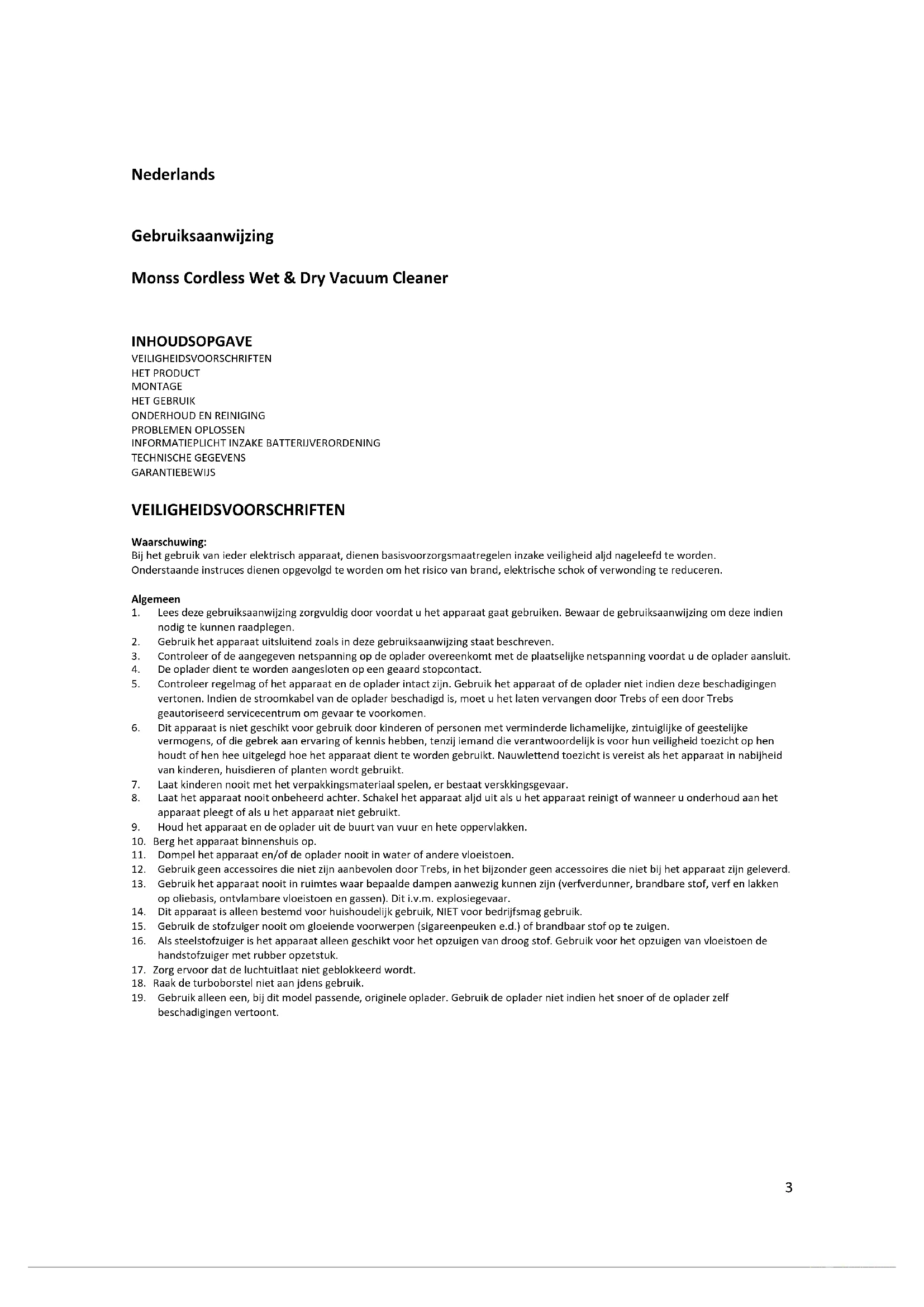SERVICE Als u na het lezen van deze gebruiksaanwijzing nog vragen heeft over het product, kunt u contact opnemen met de klantenservice: Trebs BV Thermiekstraat 1a 6361 HB Nuth Nederland www.trebs.nl www.monttiss.com CE10 Deutsch Bedienungsanleitung Montiss Cordless Wet & Dry Vacuum Cleaner INHALTSVERZEICHNIS SICHERHEITSVORSCHRIFTEN DAS PRODUKT MONTAGE DIE BENUTZUNG