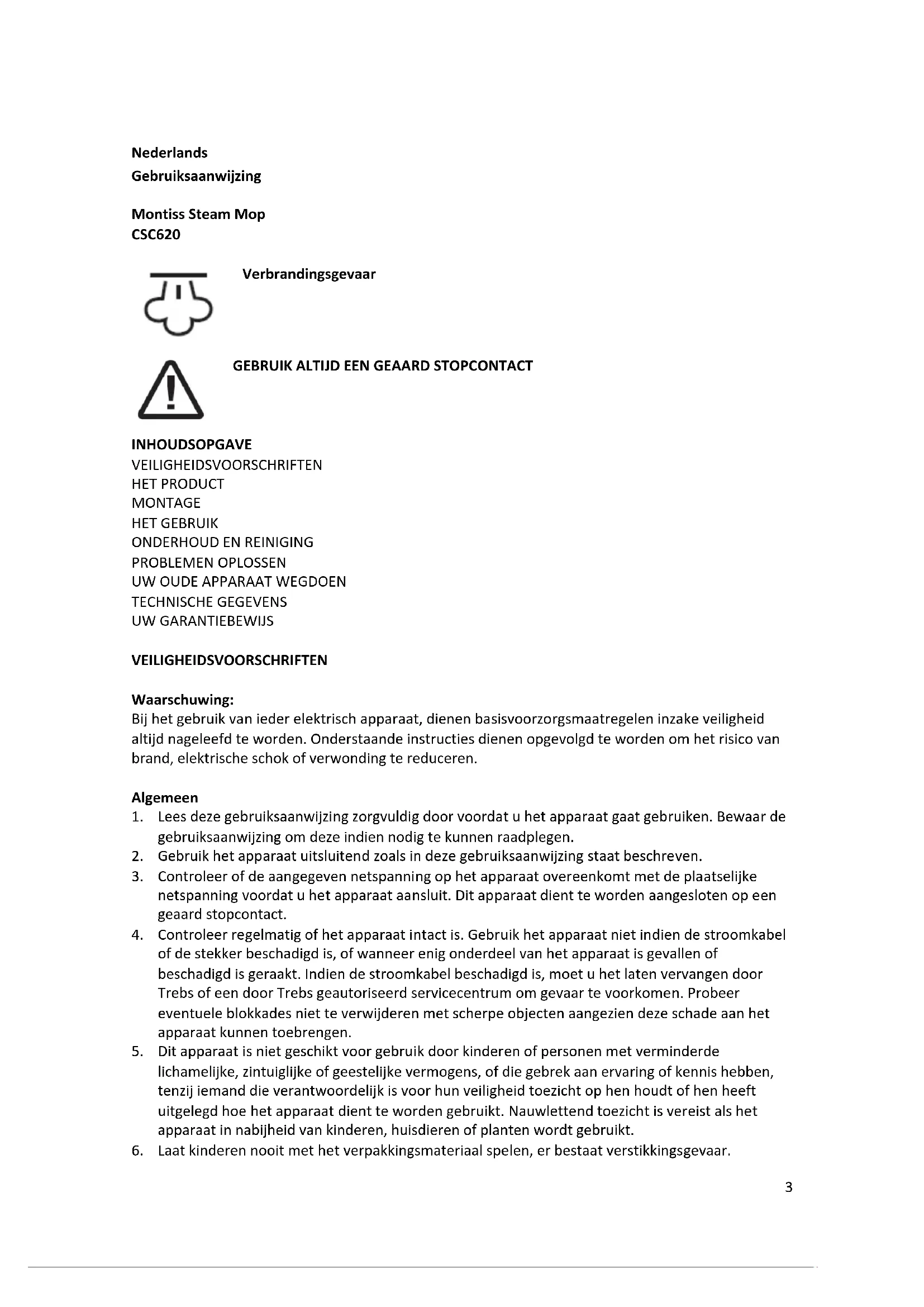 - De schade aan het apparaat niet is te wijten aan een oorzaak vreemd aan het apparaat, zoals: brandschade, waterschade, transportschade, atmosferische ontladingen of verkeerd of onvoldoende onderhoud. Mocht ondanks onze zorgvuldige kwaliteitscontrole uw apparaat niet goed functioneren, dan kunt u een beroep doen op onze service. Hiervoor verzoeken wij u om het product, inclusief een kopie van de aankoopbon, naar ons op te sturen. Om ongerief te voorkomen, raden wij u aan de gebruiksaanwijzing zorgvuldig na te lezen alvorens u tot ons te wenden. SERVICE Als u na het lezen van deze gebruiksaanwijzing nog vragen heeft over het product, kunt u contact opnemen met het Trebs klantenservice; info@trebs.nl11 Deutsch Bedienunsanleitung Montiss Steam Mop CSC620 VERBRÜHUNGSGEFAHR BENÜTZEN SIE IMMER EINE GEERDETE STECKDOSE
