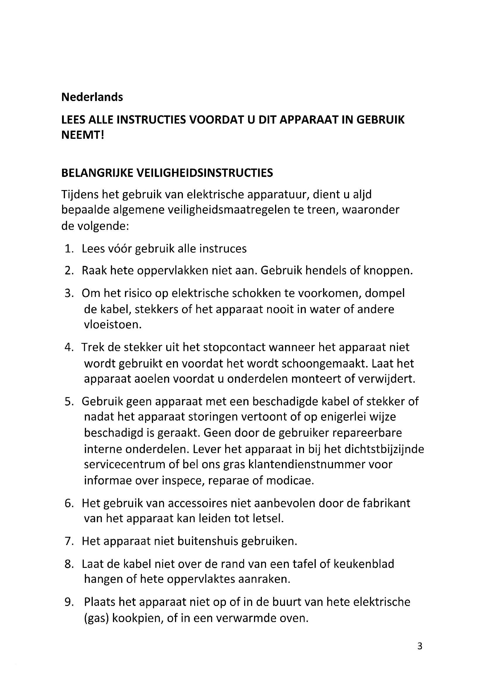 Nederlands LEES ALLE INSTRUCTIES VOORDAT U DIT APPARAAT IN GEBRUIK NEEMT! BELANGRIJKE VEILIGHEIDSINSTRUCTIES Tijdens het gebruik van elektrische apparatuur, dient u altijd bepaalde algemene veiligheidsmaatregelen te treffen, waaronder de volgende: