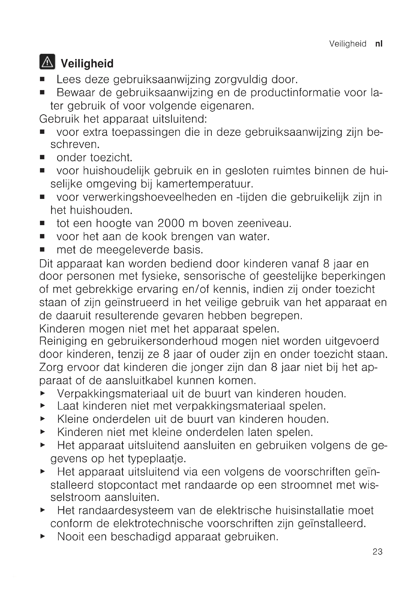 Veiligheid ¡ Lees deze gebruiksaanwijzing zorgvuldig door. ¡ Bewaar de gebruiksaanwijzing en de productinformatie voor la- ter gebruik of voor volgende eigenaren. Gebruik het apparaat uitsluitend: ¡ voor extra toepassingen die in deze gebruiksaanwijzing zijn be- schreven. ¡ onder toezicht. ¡ voor huishoudelijk gebruik en in gesloten ruimtes binnen de hui- selijke omgeving bij kamertemperatuur. ¡ voor verwerkingshoeveelheden en -tijden die gebruikelijk zijn in het huishouden. ¡ tot een hoogte van 2000m boven zeeniveau. ¡ voor het aan de kook brengen van water. ¡ met de meegeleverde basis. Dit apparaat kan worden bediend door kinderen vanaf 8 jaar en door personen met fysieke, sensorische of geestelijke beperkingen of met gebrekkige ervaring en/of kennis, indien zij onder toezicht staan of zijn geïnstrueerd in het veilige gebruik van het apparaat en de daaruit resulterende gevaren hebben begrepen. Kinderen mogen niet met het apparaat spelen. Reiniging en gebruikersonderhoud mogen niet worden uitgevoerd door kinderen, tenzij ze 8jaar of ouder zijn en onder toezicht staan. Zorg ervoor dat kinderen die jonger zijn dan 8 jaar niet bij het ap- paraat of de aansluitkabel kunnen komen. ▶ Verpakkingsmateriaal uit de buurt van kinderen houden. ▶ Laat kinderen niet met verpakkingsmateriaal spelen. ▶ Kleine onderdelen uit de buurt van kinderen houden. ▶ Kinderen niet met kleine onderdelen laten spelen. ▶ Het apparaat uitsluitend aansluiten en gebruiken volgens de ge- gevens op het typeplaatje. ▶ Het apparaat uitsluitend via een volgens de voorschriften geïn- stalleerd stopcontact met randaarde op een stroomnet met wis- selstroom aansluiten. ▶ Het randaardesysteem van de elektrische huisinstallatie moet conform de elektrotechnische voorschriften zijn geïnstalleerd. ▶ Nooit een beschadigd apparaat gebruiken.nl Veiligheid