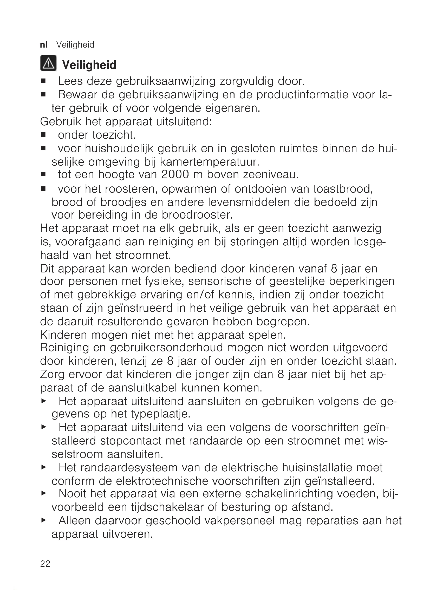 Veiligheid ¡ Lees deze gebruiksaanwijzing zorgvuldig door. ¡ Bewaar de gebruiksaanwijzing en de productinformatie voor la- ter gebruik of voor volgende eigenaren. Gebruik het apparaat uitsluitend: ¡ onder toezicht. ¡ voor huishoudelijk gebruik en in gesloten ruimtes binnen de hui- selijke omgeving bij kamertemperatuur. ¡ tot een hoogte van 2000m boven zeeniveau. ¡ voor het roosteren, opwarmen of ontdooien van toastbrood, brood of broodjes en andere levensmiddelen die bedoeld zijn voor bereiding in de broodrooster. Het apparaat moet na elk gebruik, als er geen toezicht aanwezig is, voorafgaand aan reiniging en bij storingen altijd worden losge- haald van het stroomnet. Dit apparaat kan worden bediend door kinderen vanaf 8 jaar en door personen met fysieke, sensorische of geestelijke beperkingen of met gebrekkige ervaring en/of kennis, indien zij onder toezicht staan of zijn geïnstrueerd in het veilige gebruik van het apparaat en de daaruit resulterende gevaren hebben begrepen. Kinderen mogen niet met het apparaat spelen. Reiniging en gebruikersonderhoud mogen niet worden uitgevoerd door kinderen, tenzij ze 8jaar of ouder zijn en onder toezicht staan. Zorg ervoor dat kinderen die jonger zijn dan 8 jaar niet bij het ap- paraat of de aansluitkabel kunnen komen. ▶ Het apparaat uitsluitend aansluiten en gebruiken volgens de ge- gevens op het typeplaatje. ▶ Het apparaat uitsluitend via een volgens de voorschriften geïn- stalleerd stopcontact met randaarde op een stroomnet met wis- selstroom aansluiten. ▶ Het randaardesysteem van de elektrische huisinstallatie moet conform de elektrotechnische voorschriften zijn geïnstalleerd. ▶ Nooit het apparaat via een externe schakelinrichting voeden, bij- voorbeeld een tijdschakelaar of besturing op afstand. ▶ Alleen daarvoor geschoold vakpersoneel mag reparaties aan het apparaat uitvoeren.Veiligheid nl