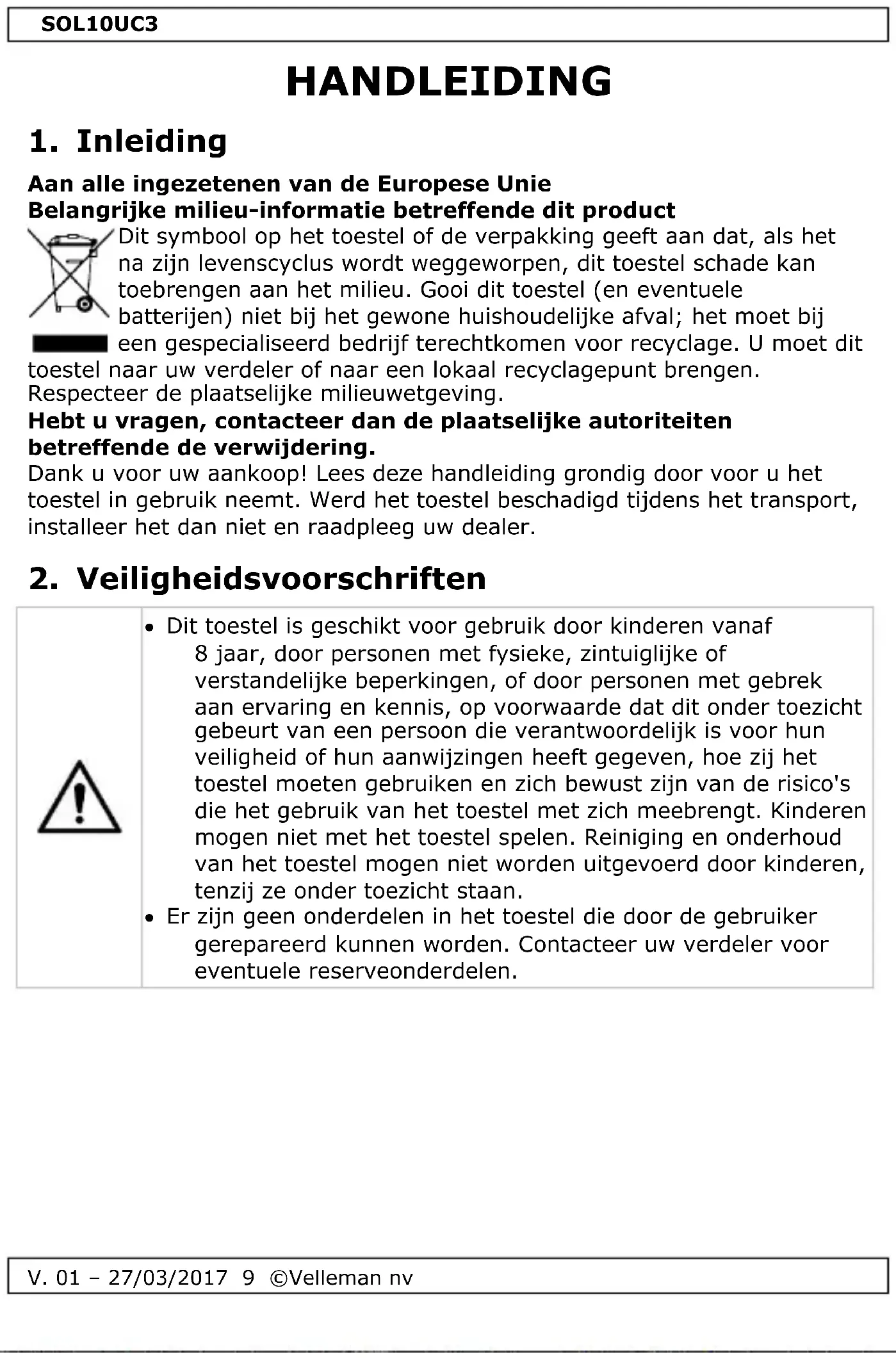 Dit toestel is geschikt voor gebruik door kinderen vanaf 8 jaar, door personen met fysieke, zintuiglijke of verstandelijke beperkingen, of door personen met gebrek aan ervaring en kennis, op voorwaarde dat dit onder toezicht gebeurt van een persoon die verantwoordelijk is voor hun veiligheid of hun aanwijzingen heeft gegeven, hoe zij het toestel moeten gebruiken en zich bewust zijn van de risico's die het gebruik van het toestel met zich meebrengt. Kinderen mogen niet met het toestel spelen. Reiniging en onderhoud van het toestel mogen niet worden uitgevoerd door kinderen, tenzij ze onder toezicht staan. Er zijn geen onderdelen in het toestel die door de gebruiker gerepareerd kunnen worden. Contacteer uw verdeler voor eventuele reserveonderdelen.SOL10UC3
