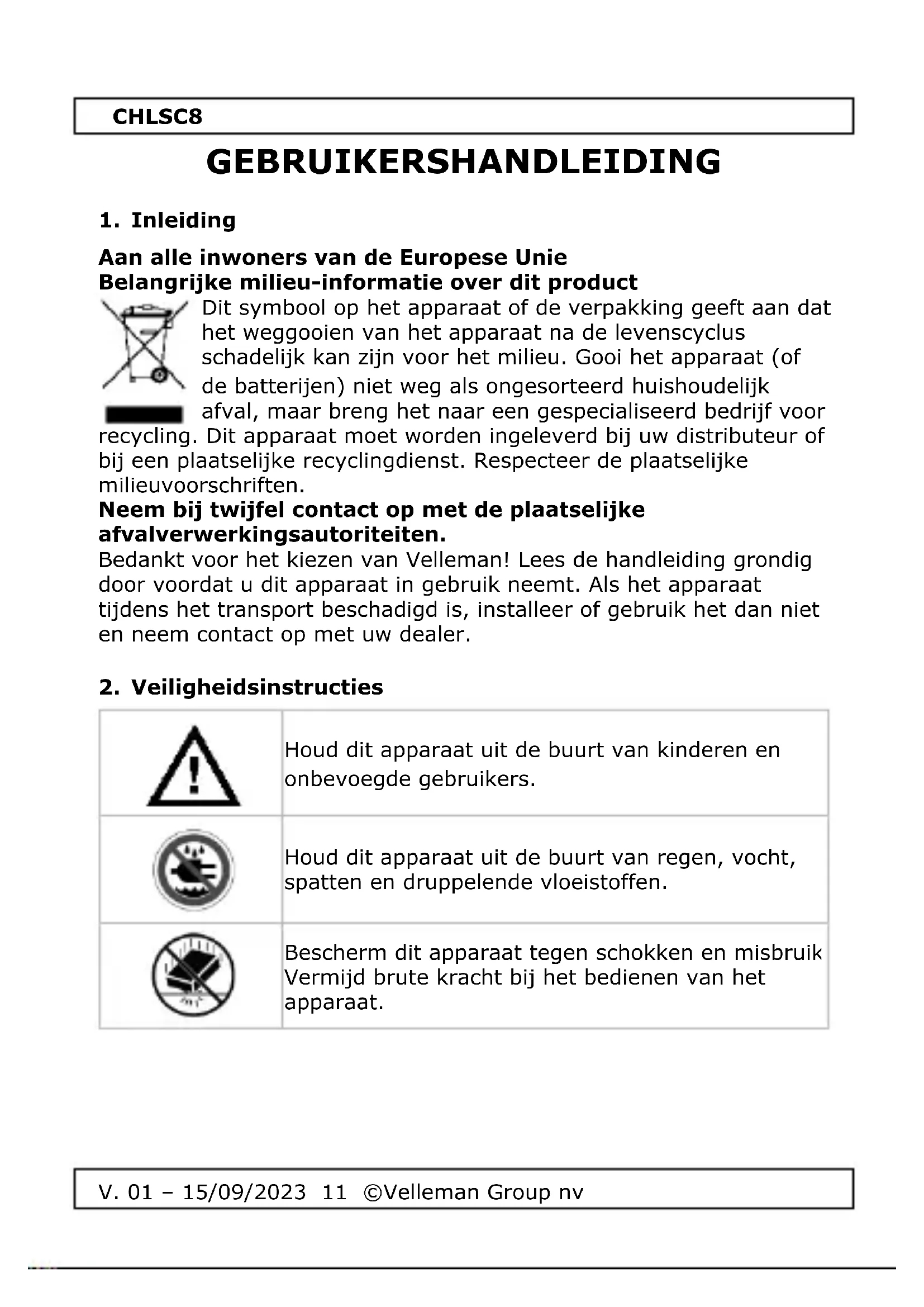 Gebruik dit toestel enkel met originele accessoires. Velleman Group nv kan niet aansprakelijk gesteld worden in geval van schade of letsel ten gevolge van (verkeerd) gebruik van dit toestel. Meer informatie over dit product en de laatste versie van deze handleiding vindt u op onze websiteCHLSC8