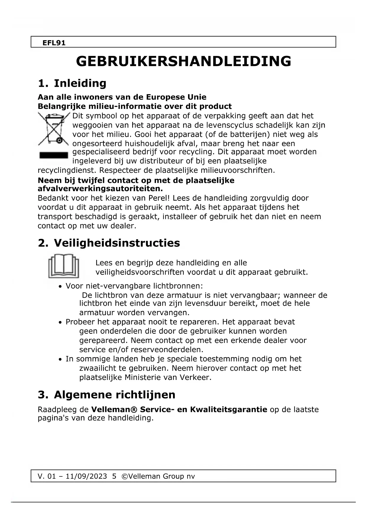 Raadpleeg de Velleman® Service- en Kwaliteitsgarantie op de laatste pagina's van deze handleiding.EFL91
