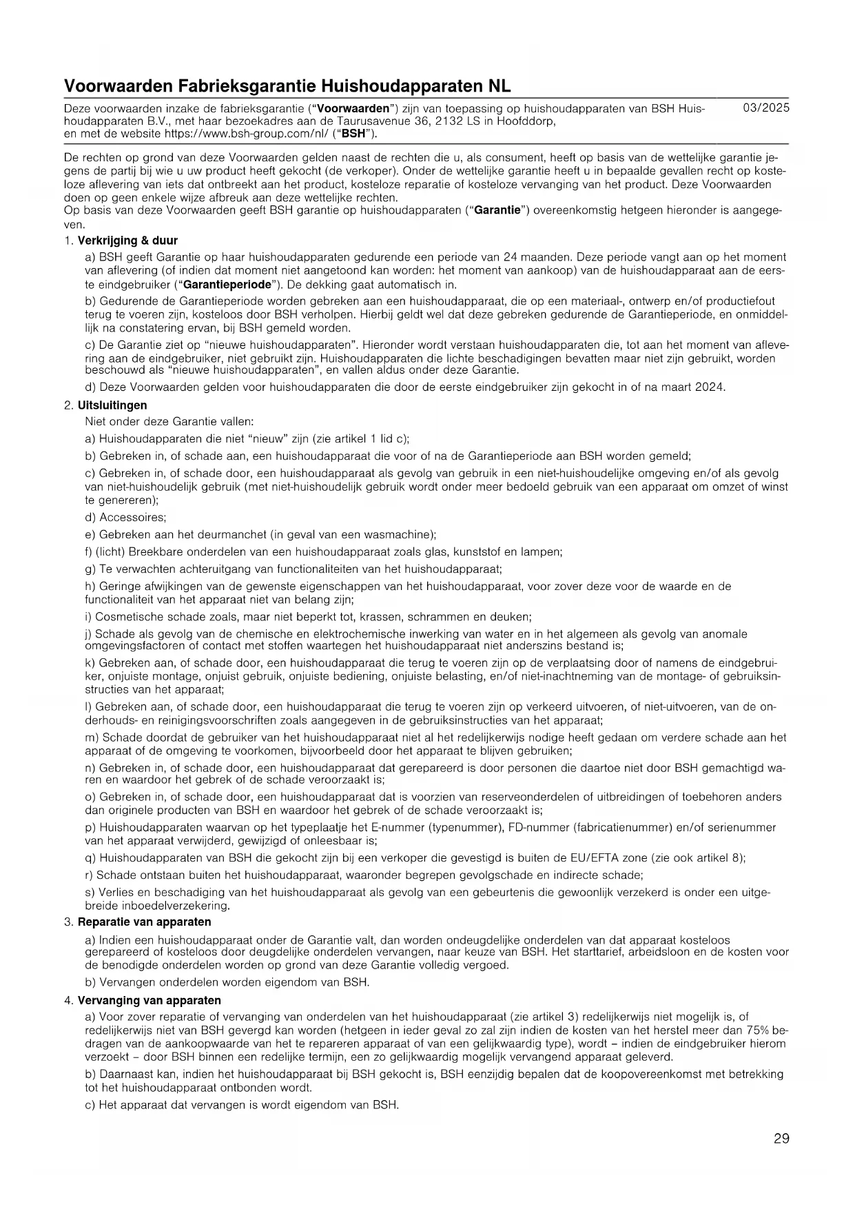 Mūsu rūpnīcas klientu apkalpošanas dienests un mūsu servisa partneri joprojām ir jums pieejami arī pēc garantijas termiņa beigām. 28Voorwaarden Fabrieksgarantie Huishoudapparaten NL Deze voorwaarden inzake de fabrieksgarantie (“Voorwaarden”) zijn van toepassing op huishoudapparaten van BSH Huis- houdapparaten B.V., met haar bezoekadres aan de Taurusavenue 36, 2132 LS in Hoofddorp, en met de website https://www.bsh-group.com/nl/ (“BSH”). 03/2025 De rechten op grond van deze Voorwaarden gelden naast de rechten die u, als consument, heeft op basis van de wettelijke garantie je- gens de partij bij wie u uw product heeft gekocht (de verkoper). Onder de wettelijke garantie heeft u in bepaalde gevallen recht op koste- loze aflevering van iets dat ontbreekt aan het product, kosteloze reparatie of kosteloze vervanging van het product. Deze Voorwaarden doen op geen enkele wijze afbreuk aan deze wettelijke rechten. Op basis van deze Voorwaarden geeft BSH garantie op huishoudapparaten (“Garantie”) overeenkomstig hetgeen hieronder is aangege- ven.