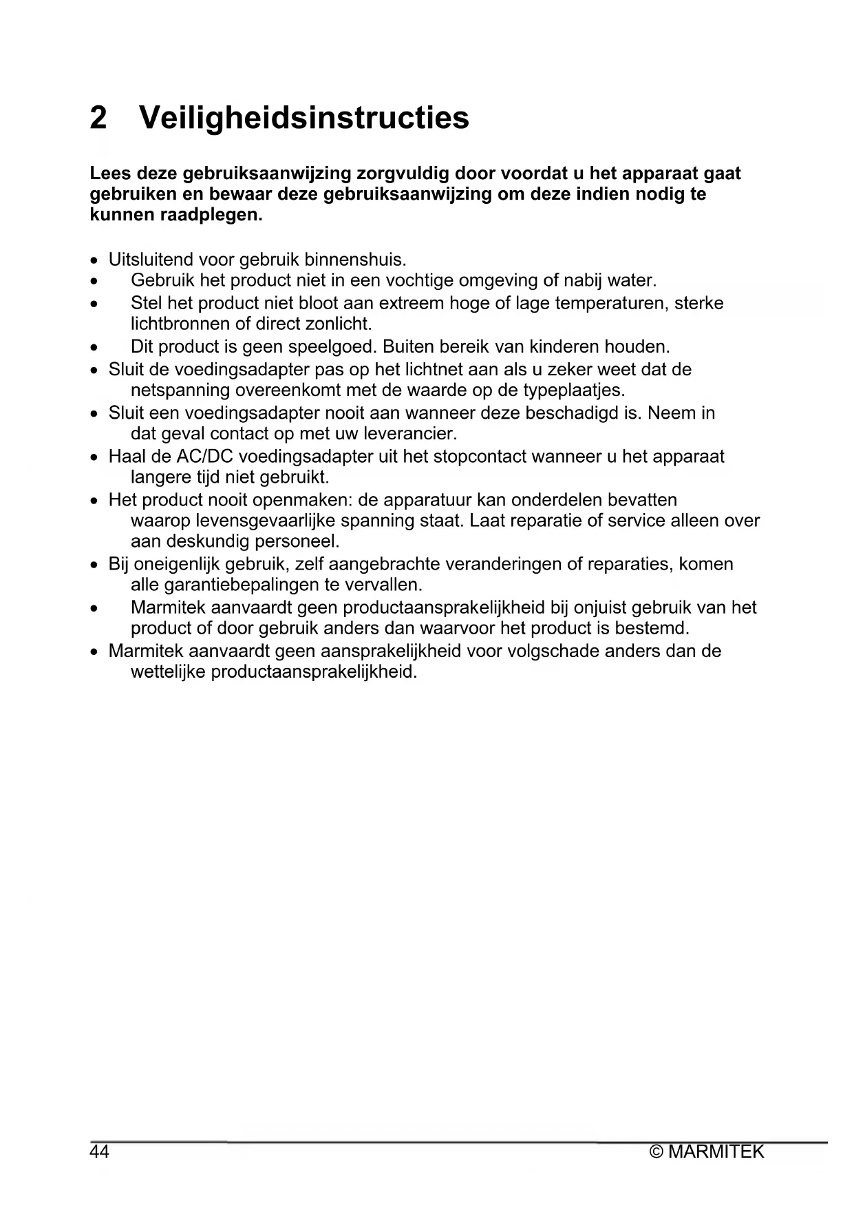 2 Veiligheidsinstructies Lees deze gebruiksaanwijzing zorgvuldig door voordat u het apparaat gaat gebruiken en bewaar deze gebruiksaanwijzing om deze indien nodig te kunnen raadplegen. x Uitsluitend voor gebruik binnenshuis. x Gebruik het product niet in een vochtige omgeving of nabij water. x Stel het product niet bloot aan extreem hoge of lage temperaturen, sterke lichtbronnen of direct zonlicht. x Dit product is geen speelgoed. Buiten bereik van kinderen houden. x Sluit de voedingsadapter pas op het lichtnet aan als u zeker weet dat de netspanning overeenkomt met de waarde op de typeplaatjes. x Sluit een voedingsadapter nooit aan wanneer deze beschadigd is. Neem in dat geval contact op met uw leverancier. x Haal de AC/DC voedingsadapter uit het stopcontact wanneer u het apparaat langere tijd niet gebruikt. x Het product nooit openmaken: de apparatuur kan onderdelen bevatten waarop levensgevaarlijke spanning staat. Laat reparatie of service alleen over aan deskundig personeel. x Bij oneigenlijk gebruik, zelf aangebrachte veranderingen of reparaties, komen alle garantiebepalingen te vervallen. x Marmitek aanvaardt geen productaansprakelijkheid bij onjuist gebruik van het product of door gebruik anders dan waarvoor het product is bestemd. x Marmitek aanvaardt geen aansprakelijkheid voor volgschade anders dan de wettelijke productaansprakelijkheid.SPLIT 614 UHD 2.0™