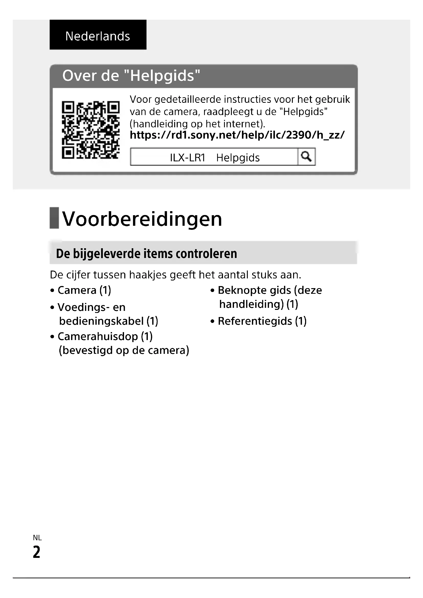 Over de "Helpgids" Voor gedetailleerde instructies voor het gebruik van de camera, raadpleegt u de "Helpgids" (handleiding op het internet).https://rd1.sony.net/help/ilc/2390/h_zz/ILX-LR1 Helpgids Nederlands Voorbereidingen De bijgeleverde items controleren De cijfer tussen haakjes geeft het aantal stuks aan.• Camera (1)• Voedings- en bedieningskabel (1)• Camerahuisdop (1) (bevestigd op de camera)• Beknopte gids (deze handleiding) (1)• Referentiegids (1)NL