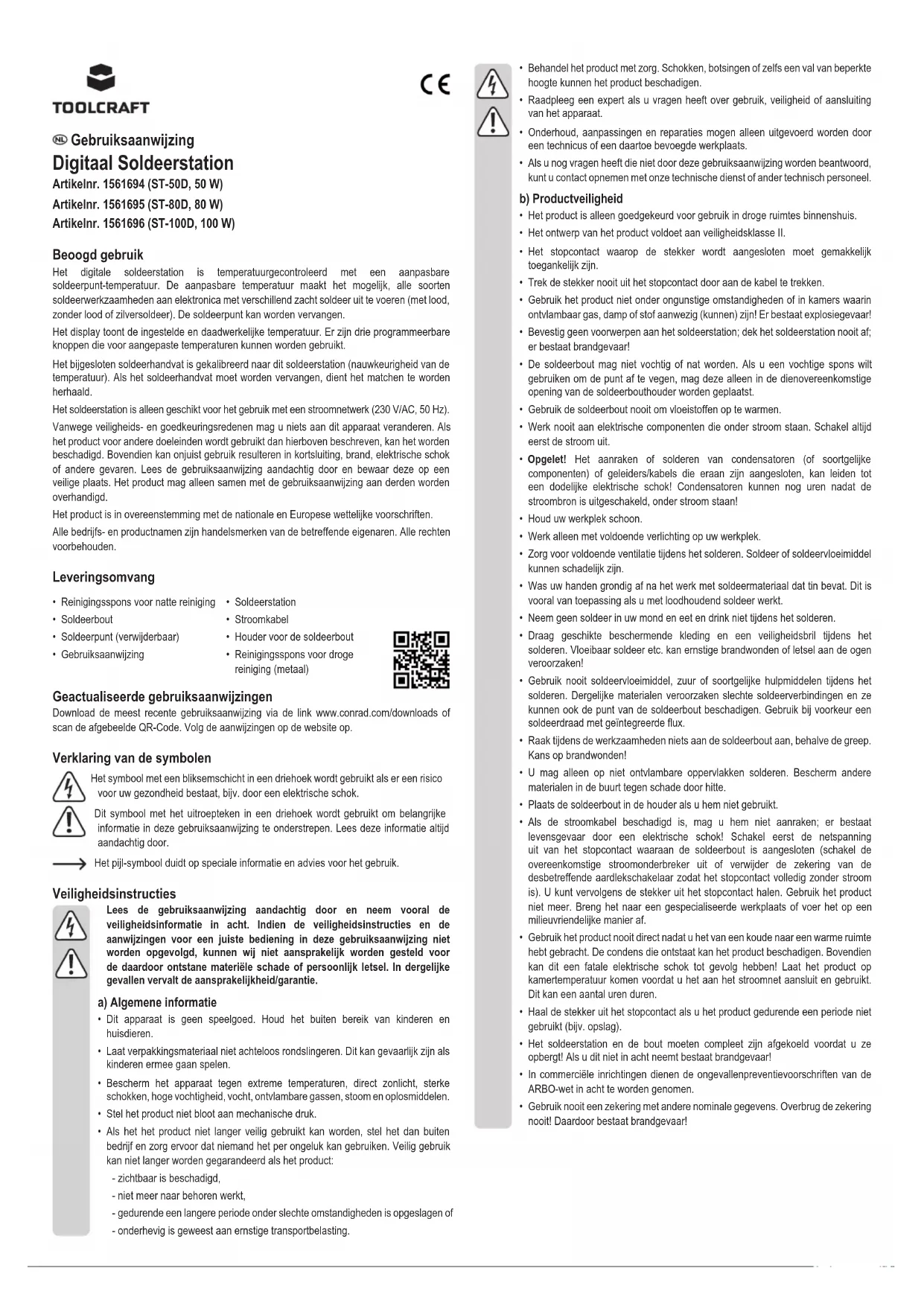 stroom (zie “Technische gegevens”). Als de zekering weer eruit vliegt na het starten van het soldeerstation, zet u het soldeerstation uit en trekt u de stekker uit het stopcontact. Gebruik het soldeerstation niet meer; laat het nakijken door een expert. Afvoer Elektronische apparaten zijn recyclebaar afval en horen niet bij het huisvuil. Als het product niet meer werkt moet u het volgens de geldende wettelijke bepalingen voor afvalverwerking afvoeren. Op deze wijze voldoet u aan uw wettelijke verplichtingen en draagt u bij aan de bescherming van het milieu. Technische gegevens Type soldeerstation ST-50D ST-80D ST-100D Artikelnr. 1561694 1561695 1561696 Bedrijfsspanning 230 V/AC, 50 Hz Vermogensverbruik max. 65 W max. 100 W max. 118 W Spanning soldeerbout 24 V/AC Uitgang soldeerbout 50 W 80 W 100 W Temperatuur van de soldeerpunt 150 °C tot 450 °C (instelbaar) Opwarmtijd (25 °C tot 450 °C) 120 s 80 s 60 s ESD/equipotentieel verbindingsstekker Diameter connector (Ø 4 mm) Veiligheidstype 5 x 20 mm Zekeringswaarde 250 V, 400 mA, traag 250 V, 630 mA, traag 250 V, 630 mA, traag Gewicht soldeerstation 1.750 g 2.030 g 2.350 g Kabellengte soldeerbout ca. 100 cm Afmetingen soldeerstation (b x h x d) 122 x 99 x 178 mm Afmetingen soldeerbouthouder (b x h x d) 71 x 85 x 158 mm