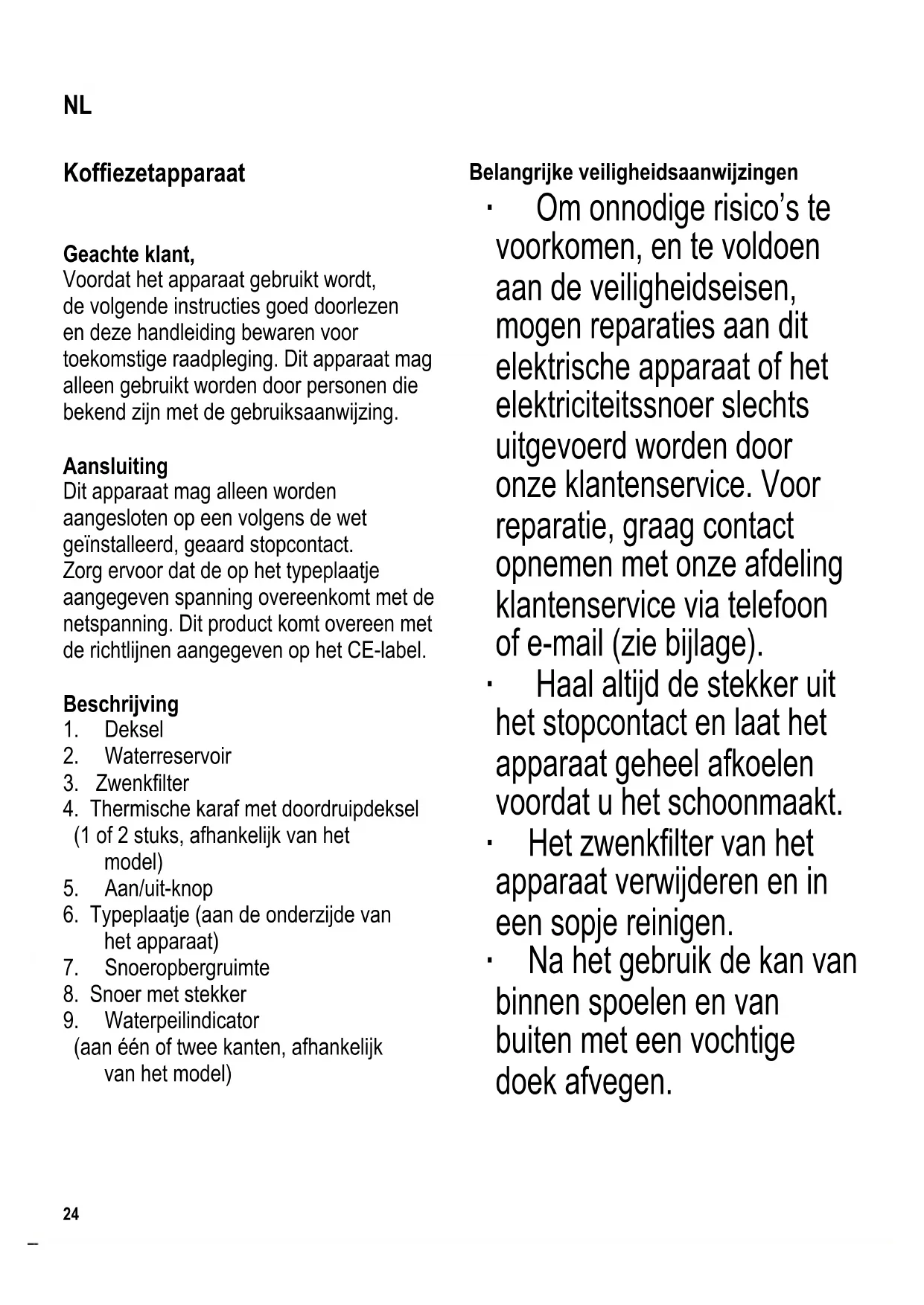 (aan één of twee kanten, afhankelijk van het model) Belangrijke veiligheidsaanwijzingen ∙ Om onnodige risico’s te voorkomen, en te voldoen aan de veiligheidseisen, mogen reparaties aan dit elektrische apparaat of het elektriciteitssnoer slechts uitgevoerd worden door onze klantenservice. Voor reparatie, graag contact opnemen met onze afdeling klantenservice via telefoon of e-mail (zie bijlage). ∙ Haal altijd de stekker uit het stopcontact en laat het apparaat geheel afkoelen voordat u het schoonmaakt. ∙ Hetzwenkltervanhet apparaat verwijderen en in een sopje reinigen. ∙ Na het gebruik de kan van binnen spoelen en van buiten met een vochtige doek afvegen. NL104 x 142 mm