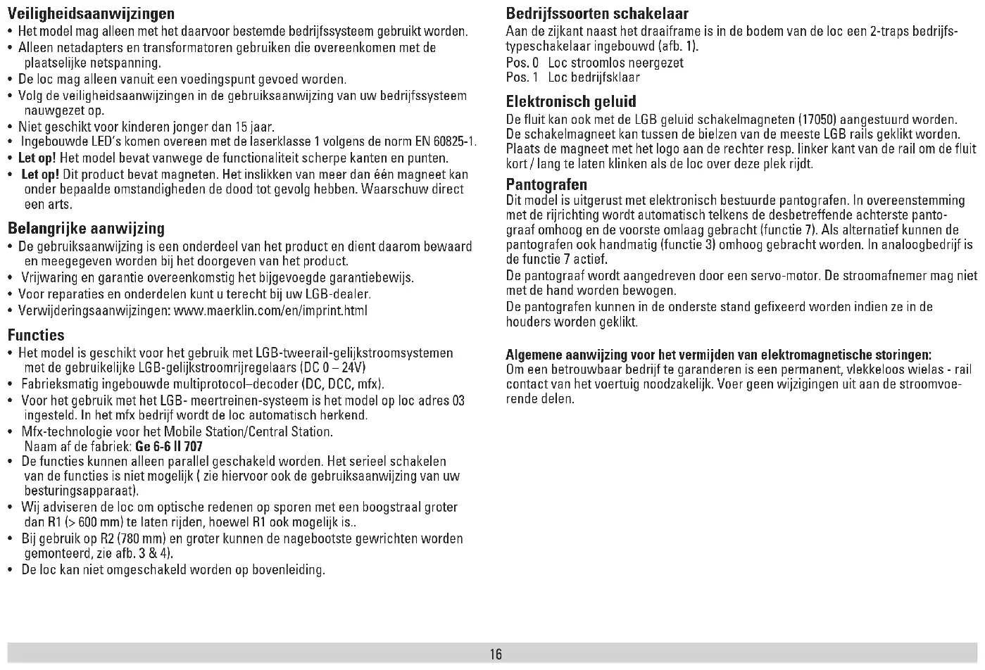 - De loc kan niet omgeschakeld worden op bovenleiding. Bedrijfssoorten schakelaar Aan de zijkant naast het draaiframe is in de bodem van de loc een 2-traps bedrijfs- typeschakelaar ingebouwd (afb. 1). Pos. 0 Loc stroomlos neergezet Pos. 1 Loc bedrijfsklaar Elektronisch geluid De fluit kan ook met de LGB geluid schakelmagneten (17050) aangestuurd worden. De schakelmagneet kan tussen de bielzen van de meeste LGB rails geklikt worden. Plaats de magneet met het logo aan de rechter resp. linker kant van de rail om de fluit kort / lang te laten klinken als de loc over deze plek rijdt. Pantografen Dit model is uitgerust met elektronisch bestuurde pantografen. In overeenstemming met de rijrichting wordt automatisch telkens de desbetreffende achterste panto- graaf omhoog en de voorste omlaag gebracht (functie 7). Als alternatief kunnen de pantografen ook handmatig (functie 3) omhoog gebracht worden. In analoogbedrijf is de functie 7 actief. De pantograaf wordt aangedreven door een servo-motor. De stroomafnemer mag niet met de hand worden bewogen. De pantografen kunnen in de onderste stand gefixeerd worden indien ze in de houders worden geklikt. Algemene aanwijzing voor het vermijden van elektromagnetische storingen: Om een betrouwbaar bedrijf te garanderen is een permanent, vlekkeloos wielas - rail contact van het voertuig noodzakelijk. Voer geen wijzigingen uit aan de stroomvoe- rende delen.17 Multiprotocolbedrijf Analoogbedrijf De decoder kan ook op analoge modelbanen of spoortrajecten gebruikt worden. De decoder herkent de analoge gelijkspanning (DC) automatisch en past zich aan de analoge railspanning aan. Alle functies die onder mfx of DCC voor het analoge bedrijf zijn ingesteld, worden geactiveerd (zie digitaalbedrijf). De ingebouwde soundfuncties zijn af fabriek niet actief bij analoog bedrijf. Digitaalbedrijf De Decoder is een multiprotocoldecoder. De decoder kan onder de volgende digitale protocollen ingezet worden: mfx, DCC. Het digitaalprotocol met de meeste mogelijkheden is het primaire digitaalprotocol. De volgorde van de digitaalprotocollen is afnemend in mogelijkheden: Prioriteit 1: mfx; Prioriteit 2: DCC; Prioriteit 3: DC Opmerking: de digitale protocollen kunnen elkaar beïnvloeden. Voor een storingsvrij bedrijf is het aan te bevelen de niet gebruikte protocollen met CV 50 te deactiveren. Deactiveer eveneens, voor zover uw centrale dit ondersteunt, ook de daar niet gebruikte digitale protocollen. Worden twee of meer digitaal protocollen op de rails herkend, dan neemt de decoder automatisch het protocol met de hoogste prioriteit, bijv. mfx/DCC, dan wordt door de decoder het mfx-digitaalprotocol gebruikt (zie bovenstaand overzicht). Opmerking: let er op dat niet alle functies in alle digitaalprotocollen mogelijk zijn. Onder mfx of DCC kunnen enkele instellingen, welke in analoogbedrijf werkzaam moeten zijn, ingesteld worden. Aanwijzingen voor digitale besturing