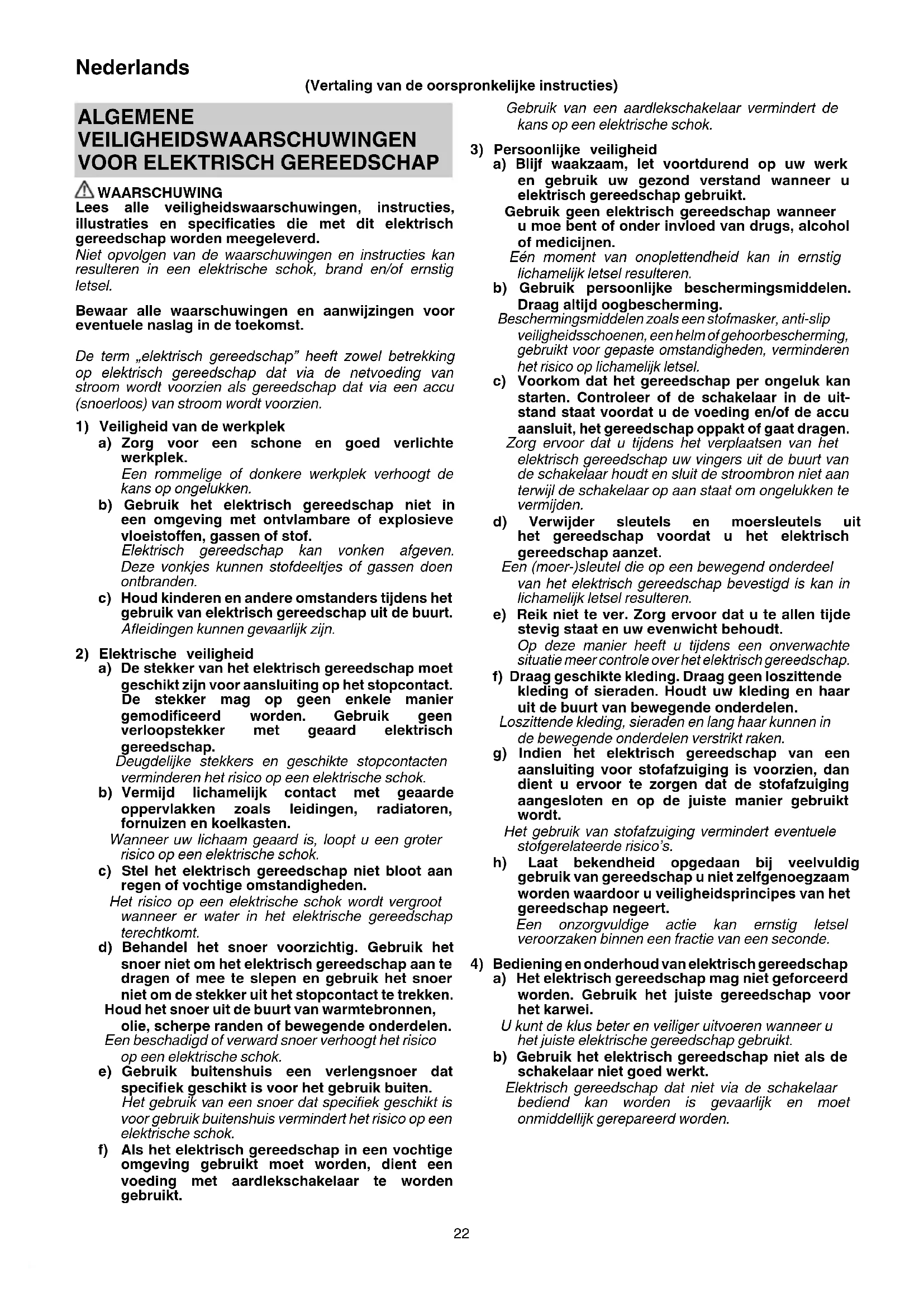 Bediening en onderhoud van elektrisch gereedschap a) Het elektrisch gereedschap mag niet geforceerd worden. Gebruik het juiste gereedschap voor het karwei. U kunt de klus beter en veiliger uitvoeren wanneer u het juiste elektrische gereedschap gebruikt. b) Gebruik het elektrisch gereedschap niet als de schakelaar niet goed werkt. Elektrisch gereedschap dat niet via de schakelaar bediend kan worden is gevaarlijk en moet onmiddellijk gerepareerd worden. ALGEMENE VEILIGHEIDSWAARSCHUWINGEN
