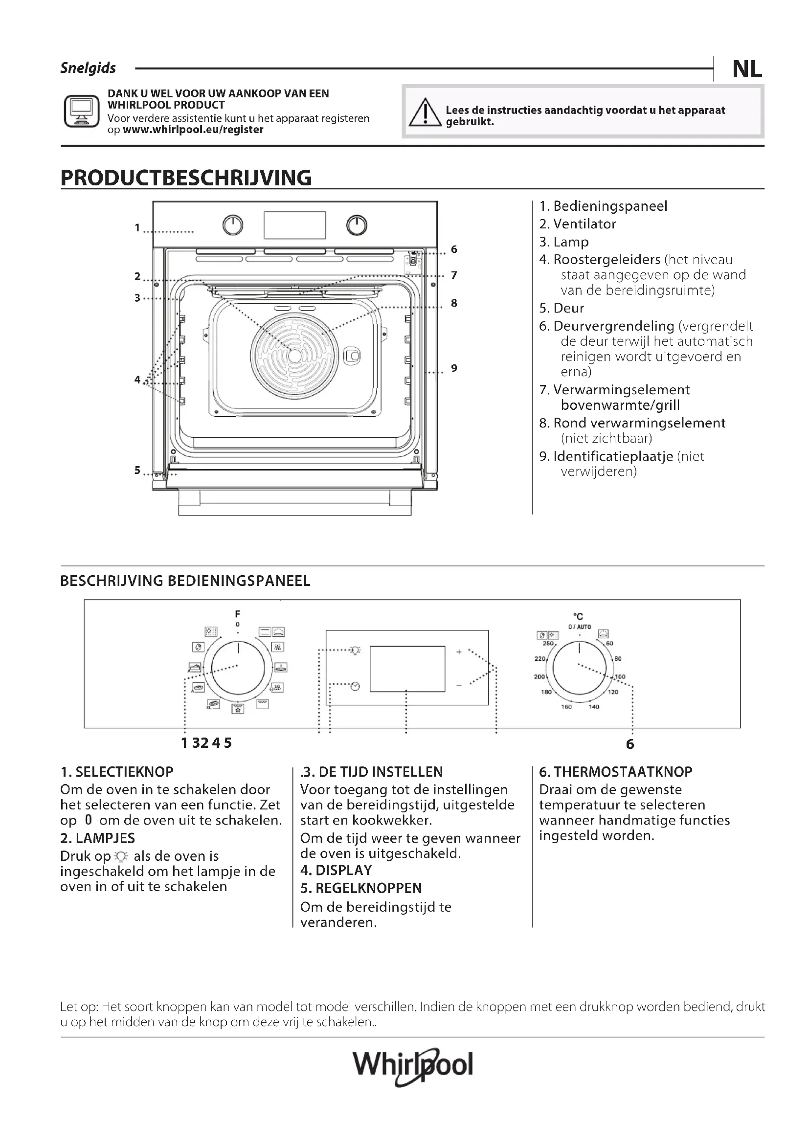 - Disponibile solo su alcuni modelliNL Snelgids DANK U WEL VOOR UW AANKOOP VAN EEN WHIRLPOOL PRODUCTVoor verdere assistentie kunt u het apparaat registeren op www.whirlpool.eu/registerLees de instructies aandachtig voordat u het apparaat gebruikt. PRODUCTBESCHRIJVING